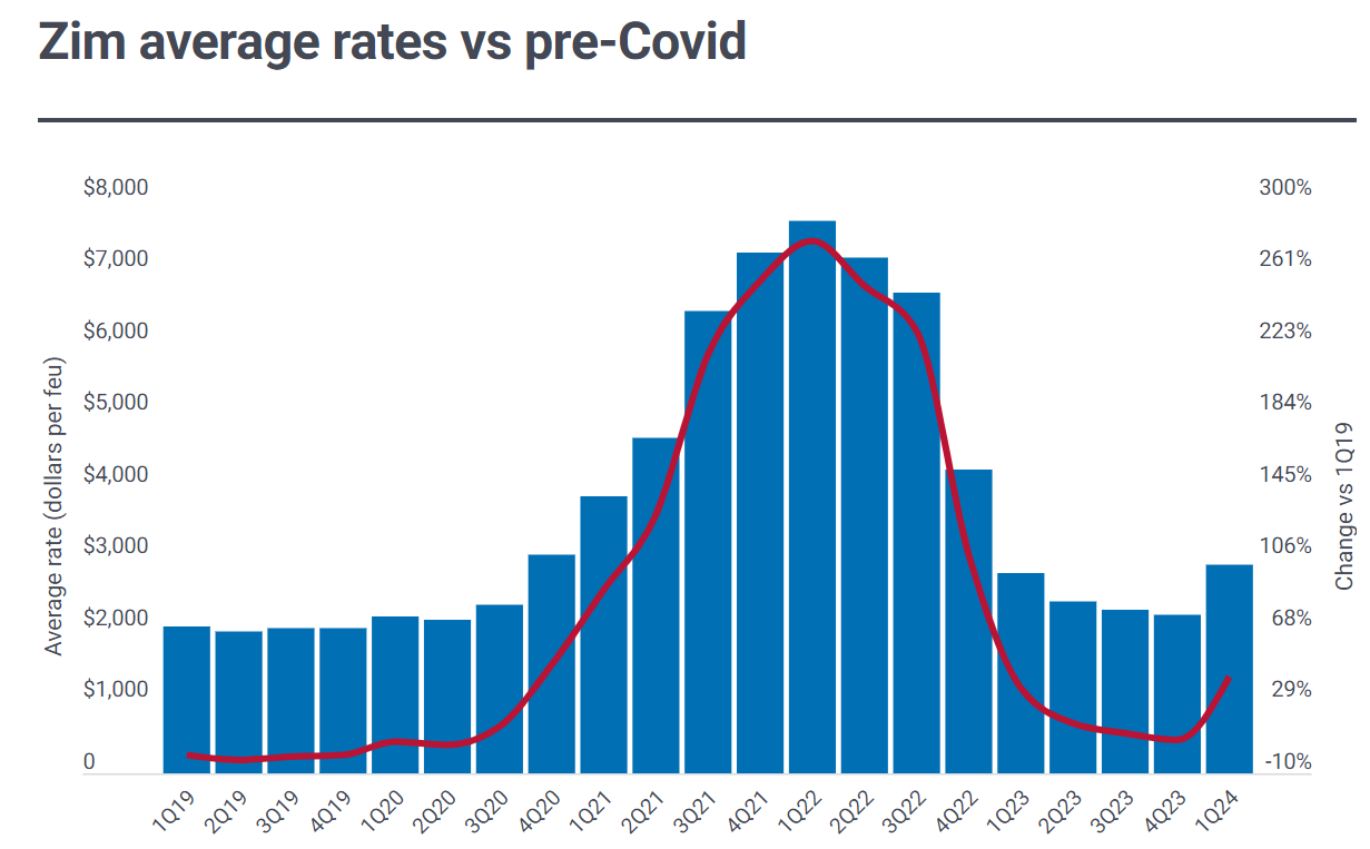 - Spoločnosť v komentári k výsledkom za 1. štvrťrok 2024 uviedla, že očakáva vyššie sadzby za nákladnú dopravu, a to po dlhšiu dobu, ako pôvodne predpokladala. Výsledky za 1. štvrťrok dosiahli čistý zisk 92 miliónov USD v porovnaní so stratou 58 miliónov USD v 1. štvrťroku 2023 a stratou 147 miliónov USD vo 4. štvrťroku 2023. Spoločnosť ZIM prepravila 846 000 TEU, čo je medziročne o 10 % viac a k/k o 8 % viac. Spotové a zmluvné sadzby vzrástli na 2904 USD za feu a boli medziročne vyššie o 5 % a k/k o 32 %. Zvýšili sa aj o 42 % oproti 1. štvrťroku 2019.