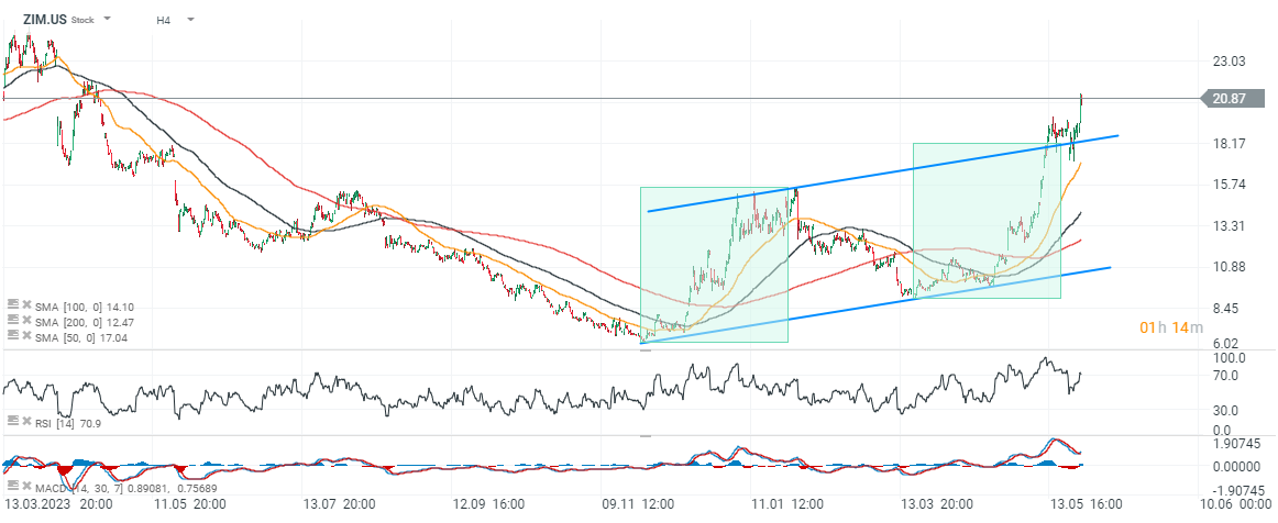 Akcie izraelskej prepravnej spoločnosti ZIM Integrated Shipping (ZIM.US) dnes zaznamenali ďalšiu úspešnú seansu, keď si pripísali takmer 8 %. Spoločnosť naďalej podporujú solídne makrodáta z globálnej ekonomiky. Spoločnosť nedávno oznámila výsledky, ktoré zaostali za očakávaniami, ale predpovedala obnovenie výplaty dividend v roku 2024, čo podporilo náladu investorov. V dôsledku toho sa akcie obchodujú s takmer 120 % nárastom z tohtoročných miním a od začiatku roka si pripísali už takmer 90 %.
