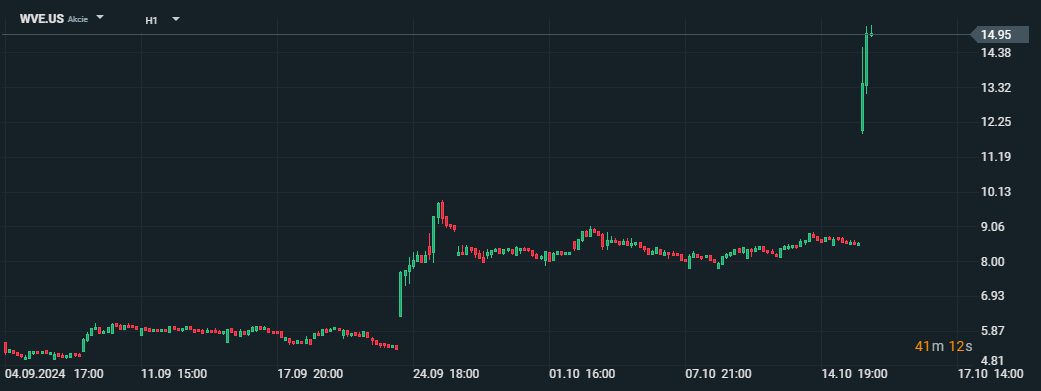 Akcie spoločnosti Wave Life Sciences (WVE.US) v stredu počas obchodovania vzrástli o 4,82 USD a dosiahli cenu 13,38 USD. Objem obchodov dosiahol 7 289 611 akcií, čo je výrazne nad priemerom 1 018 745 akcií. Trhová kapitalizácia spoločnosti je 1,67 miliardy USD, s pomerom P/E -23,98 a beta hodnotou -1,10. Spoločnosť sa v súčasnosti obchoduje nad svojou 50-dňovou a 200-dňovou priemernou cenou.