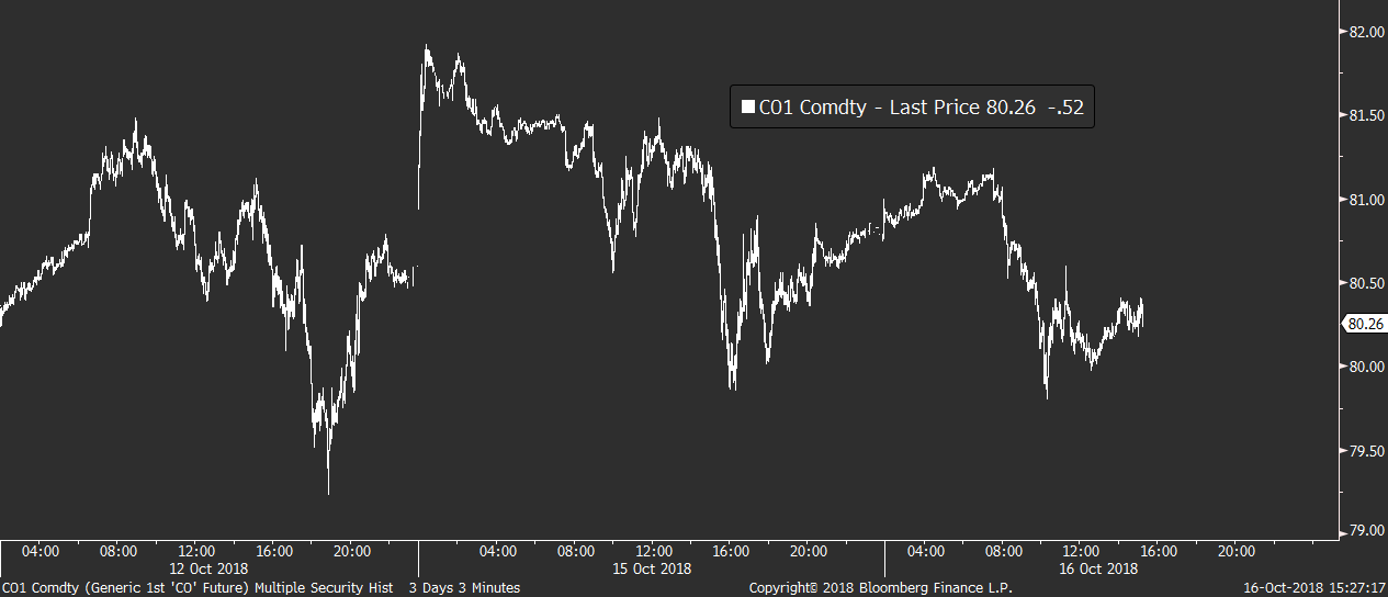 Z dalších témat se i nadále mluví hlavně o rostoucím napětí mezi USA a Saúdskou Arábií, která se dnes snaží žehlit obvinění z vraždy Saúdského novináře. Vraždu nyní připouští, ale svádí ji na „nedopatření“ při jeho výslechu na ambasádě v Turecku. Ropa ale i dnes zatím zůstává v klidu a v případě Brentu osciluje nad 80 dolary za barel.
