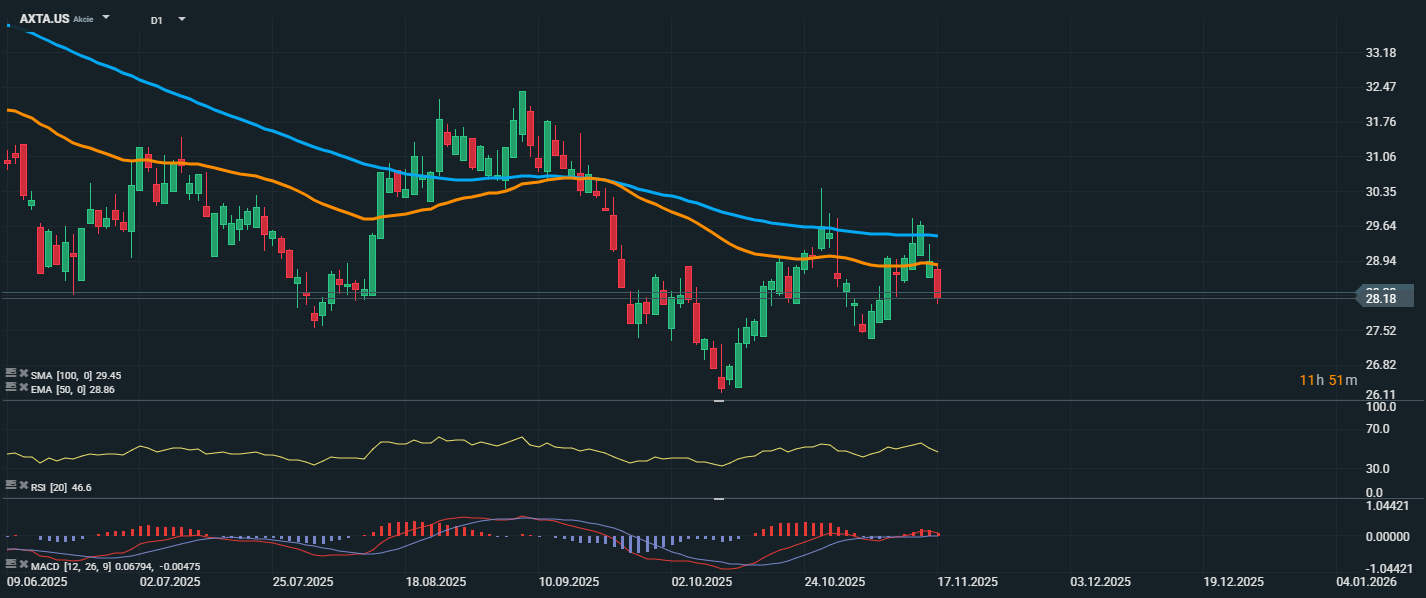 Akcie spoločnosti Axalta Coating Systems sa po krátkodobom raste opäť dostali pod tlak a aktuálne sa obchodujú na úrovni 28,18 USD. Cena sa neudržala nad kĺzavým priemerom EMA 50 (28,86 USD) a opäť klesla pod SMA 100 (29,45 USD), čo naznačuje oslabenie býčieho momenta a potvrdzuje pretrvávajúcu medvediu štruktúru. RSI je na hodnote 46,6, teda v neutrálnom pásme, ale s mierne klesajúcim trendom, čo signalizuje nízku nákupnú silu.