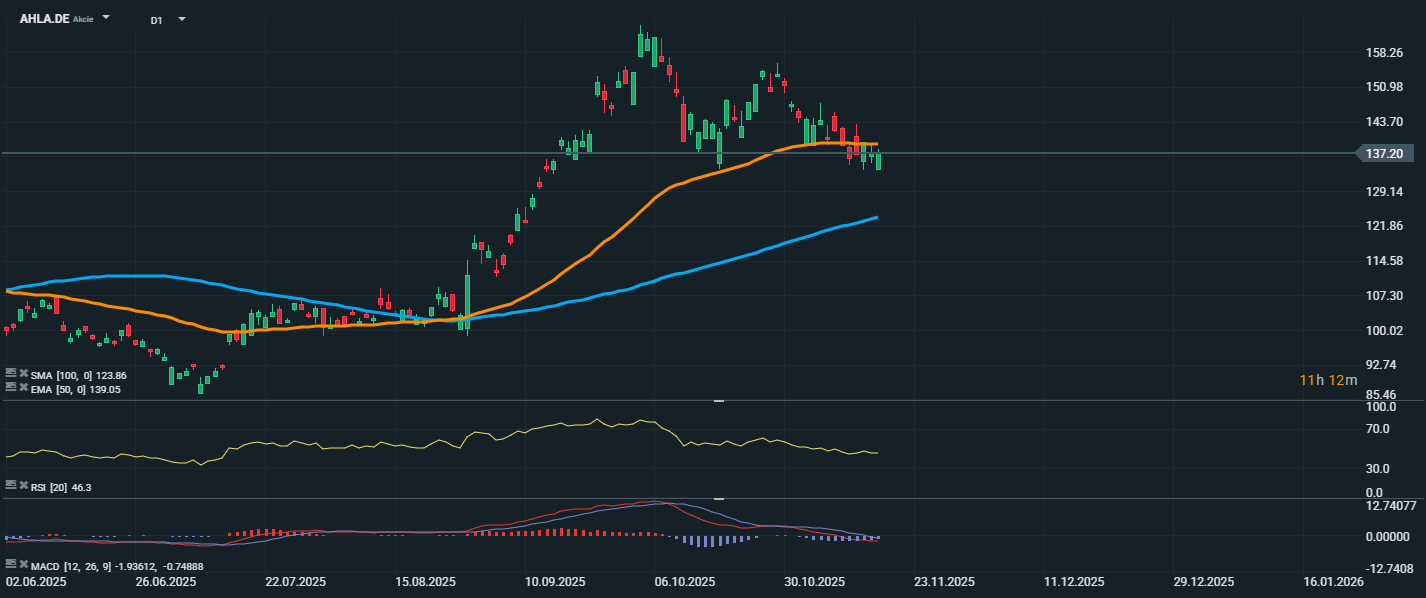 Akcie Alibaba Group po silnom raste v septembri a októbri vstúpili do korekcie a aktuálne sa obchodujú na úrovni 137,20 EUR. Cena sa nachádza pod EMA 50 (139,05 EUR), čo naznačuje slabnúci býčí moment. V posledných dňoch dochádza ku konsolidácii pod touto úrovňou bez jasného obratu. SMA 100 (123,86 EUR) zostáva kľúčovou podporou, ktorá môže byť otestovaná, ak sa rast neobnoví. RSI je na hodnote 46,3, teda v neutrálnom pásme s klesajúcim trendom, čo odráža zvýšený predajný tlak.