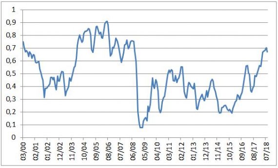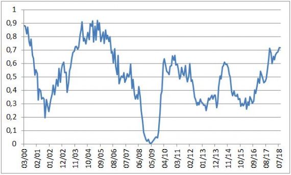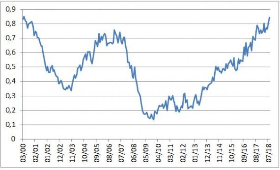 Ako je však vidno, tak ani jeden z týchto ukazovateľov nie je na maximách, pričom celkový index je. Dôvodom sú nižšie nerovnováhy, ich subindex bol totiž počas väčšiny minulej dekády mimoriadne nízko. Dnes to vyzerá byť podstatne lepšie (najmä čo sa týka zadlženia súkromnej sféry). Na druhej strane, nerovnováhy boli už v histórii aj nižšie.