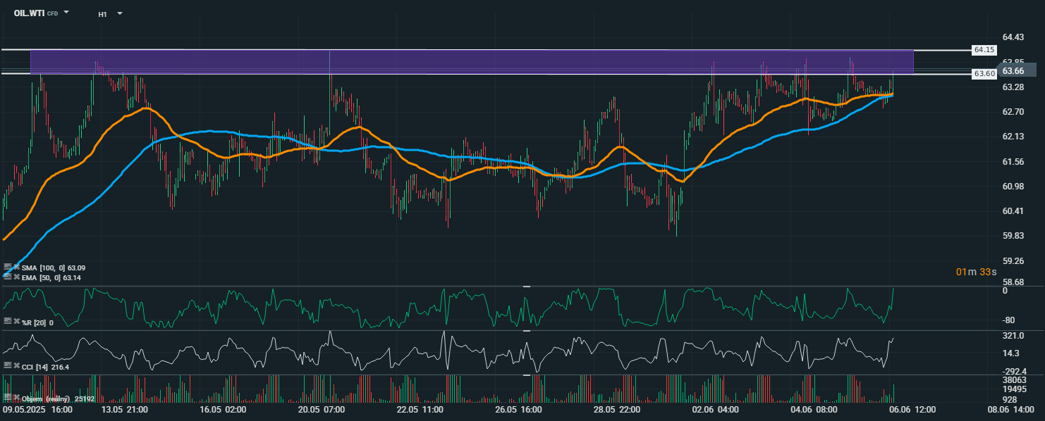 Cena WTI ropy sa opakovaně približuje k silnej rezistenčnej zóne medzi 63,60 a 64,15 USD, kde trh v minulosti narazil na predajný tlak a nedokázal túto úroveň trvalo prekonať. V krátkodobom horizonte sa však technický obraz zlepšuje, keďže cena sa nachádza nad oboma kĺzavými priemerkami – SMA 100 (63,09 USD) aj EMA 50 (63,14 USD), čo naznačuje pozitívny trend. CCI prudko vystrelil nad úroveň 200, čo signalizuje silné krátkodobé prepredanie alebo výber ziskov, zatiaľ čo indikátor %R vystúpil blízko nulovej úrovne, čo môže byť známkou rastúcej nákupnej sily. Ak by došlo k prekonaniu rezistencie 64,15 USD, mohlo by sa otvoriť priestor pre ďalší rast, inak hrozí opakované odmietnutie a návrat na nižšie úrovne okolo 62 až 61,50 USD.
