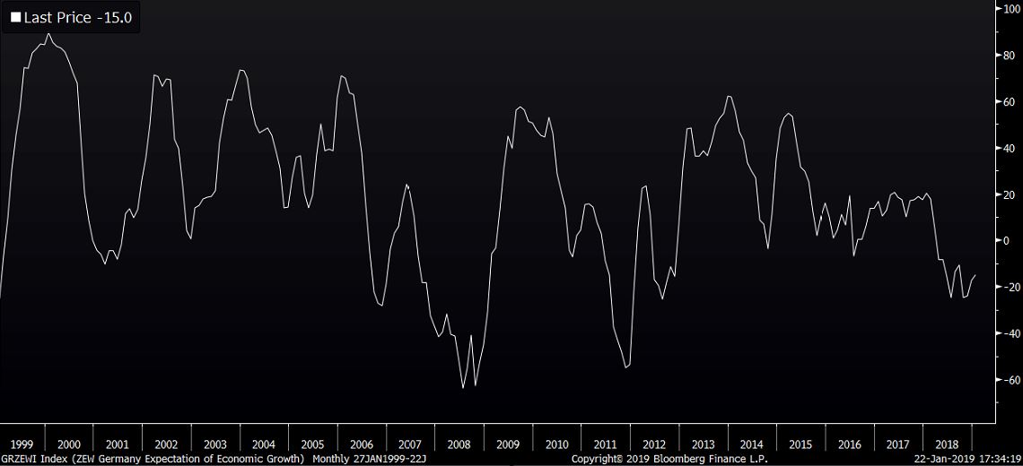 Nemecký ZEW index ekonomických očakávaní vzrástol už druhý mesiac po sebe na z -17,5b na -15b. (očakával sa jemný pokles na -18,8). Záporné číslo znamená, že väčšina respondentov stále očakáva ďalšie spomalenie nemeckej ekonomiky, je ich však menej ako v predošlých troch mesiacoch. Čiastočne je to dané aj slabým aktuálnym ekonomickým vývojom, ktorý obmedzuje priestor pre ďalšie spomalenie. Každopádne, ZEW stagnuje už viac ako pol roka, a to výrazne nad úrovňami z posledných recesií, čo môže byť určitým signálom, že spomalenie nemusí byť príliš výrazné.