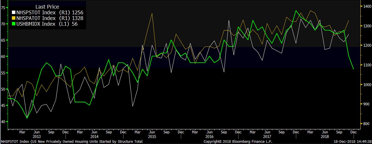 Navyše, slabé čísla prichádzajú v posledných mesiacoch aj z predaja domov, novembrové dáta ešte síce k dispozícii nie sú, v októbri však boli predaje domov na primárnom (nové domy) aj sekundárnom trhu na úrovniach z rokov 2015/2016, čo tiež nie je pre stavebníkov práve najpozitívnejšie prostredie. Vyzerá to teda tak, že trh s bývaním ostane naďalej slabším miestom americkej ekonomiky.