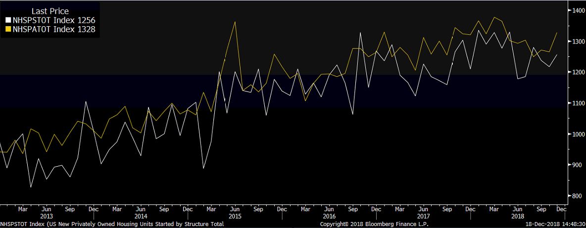 Dnešné čísla z amerického trhu s bývaním nepotvrdili zostupný trend. Nové vydané stavebné povolenia vzrástli v novembri z 1,27 mil. anualizovane na 1,33 mil., čo je najviac od apríla a začaté stavby domov z 1,22 mil. na 1,26 mil., čo je najvyššia úroveň od augusta a druhá najvyššia od mája. V oboch prípadoch sa pritom počítalo so stagnáciou.