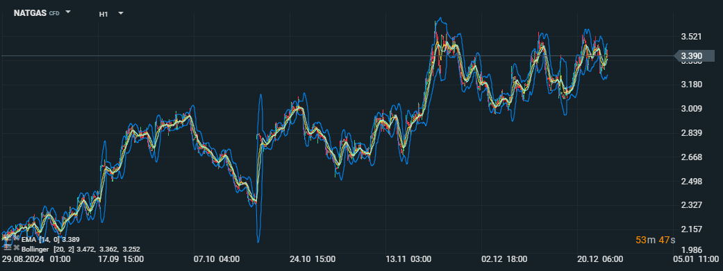 Ceny zemného plynu sa pohybujú na úrovni 3,390 USD; Bollingerove pásma ukazujú na zvýšenú volatilitu, zatiaľ čo EMA (14) signalizuje stabilný rastový trend. Zdroj: xStation5