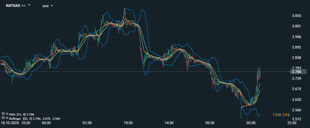 Cena zemného plynu na CFD sa po dosiahnutí minima okolo 2,566 USD/mmBtu odrazila späť na úroveň 2,766 USD. Indikátory Bollingerove pásma (BB) a exponenciálny kĺzavý priemer (EMA) ukazujú volatilné pohyby v rámci nadbytku zásob a mierneho počasia, ktoré naďalej tlačia na trh. Zdroj: xStation5