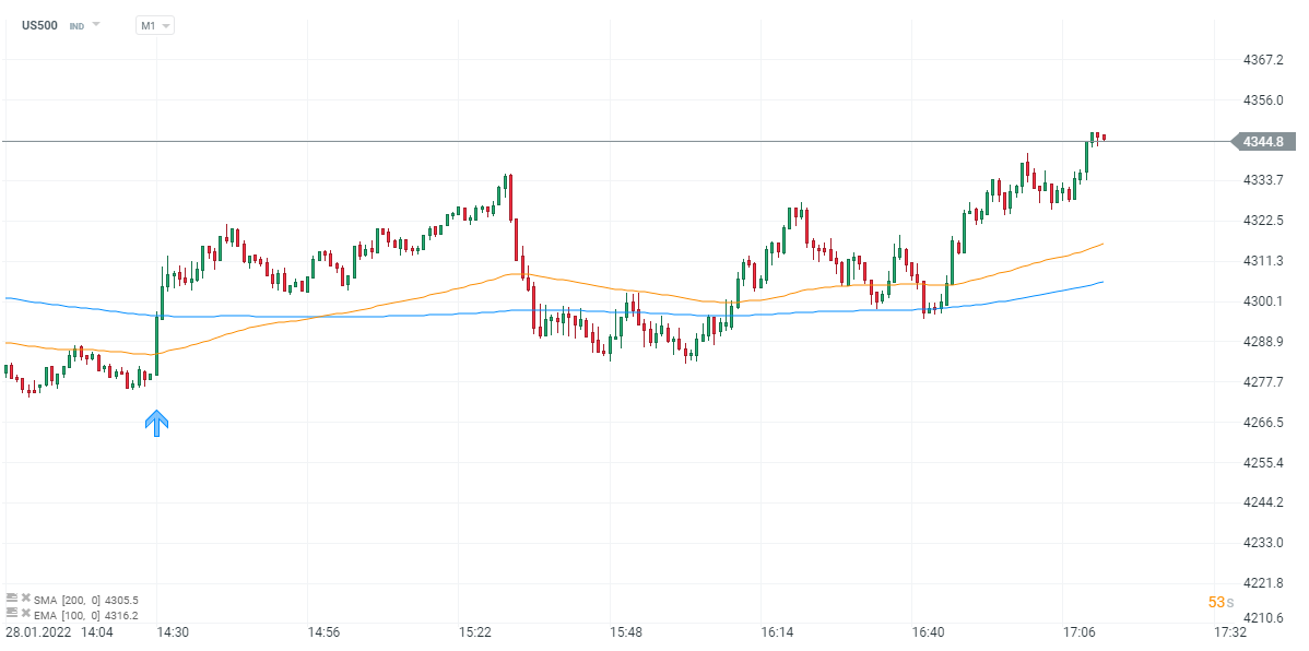 US500 a další indexy dnes pozitivně reagovaly na data z USA. Index nákladů na pracovní sílu ukázal jejich zpomalení v Q4 2021. To by mohlo znamenat, že pracovní trh v USA se nasytil, takže inflační tlaky by nemusely být tak vysoké, jak se dosud spekulovalo. A Fed by nemusel zvyšovat sazby tak razantně, jak vyplynulo z posledního zasedání v tomto týdnu.