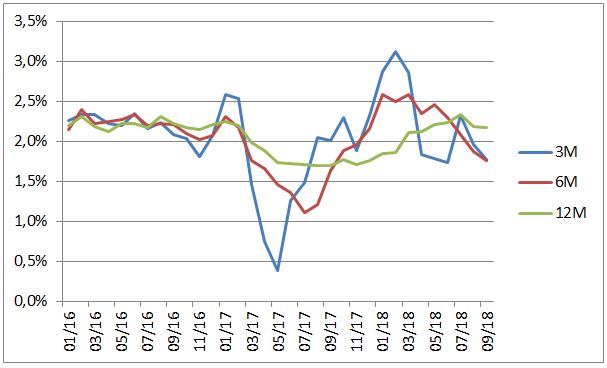 Keď sa však pozrieme na kratšie miery jadrovej inflácie – troj a šesťmesačnú anualizovanú, tak obe miery zostúpili tesne pod 1,8%. Trojmesačná anualizovaná inflácia je najnižšia od júna a šesťmesačná dokonca za posledný rok. Inflačné tlaky teda slabnú.