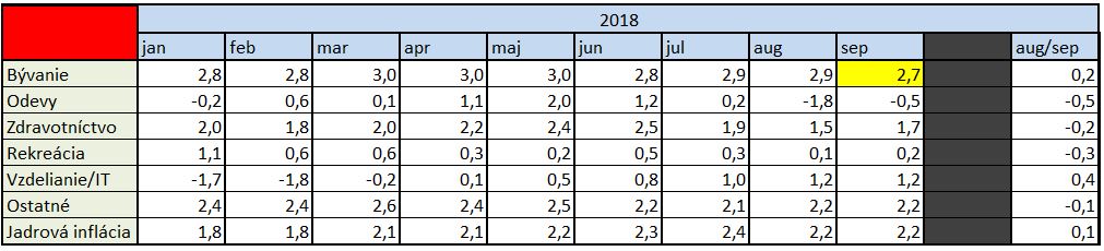 Keď sa pozrieme na jadrovú infláciu cez jednotlivé kategórie, tak je vidno, že o spomalenie sa postarala výhradne jedna položka – bývanie. Ceny bývania (vrátane výbavy domácností a ďalších jadrových výdavkov) rástli medziročne o 2,7%. To bolo najmenej za posledné dva roky. Bývanie má na jadrovej inflácii podiel viac ako 53%, čiže ju môžeme označiť za hlavného vinníka spomalenia nielen celkovej, ale aj jadrovej inflácie.