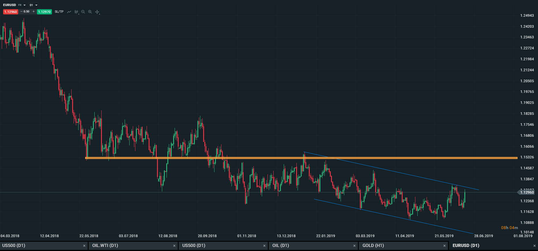 Uvoľňovanie monetárnej politiky Fedu, by mohlo pomôcť menovému páru EURUSD dostať sa z klesajúceho trendového kanála. V prípade, ak pár dokáže uzatvoriť obchodný týždeň nad úrovňou 1,13 (vrchná úroveň kanála), otvorí sa priestor pre rast k úrovni 1,15. Zdroj: xStation5