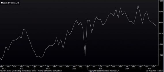 Pred chvíľou boli zverejnené predaje domov na sekundárnom trhu v USA. V anualizovanej miere sa ich v júli predalo 5,34 mil. Bolo to najhoršie číslo od februára 2016. Vyzerá to tak, že vyššie hypotekárne sadzby začínajú tlmiť dopyt na trhu s bývaním. Za tridsaťročnú fixnú hypotéku aktuálne zaplatia Američania zhruba 4,5% (v závislosti od zdroja). Naposledy takéto sadzby platili v rokoch 2013/2014. Nejedná sa o rýchly nárast, priemerné sadzby sú na aktuálnych úrovniach od apríla.