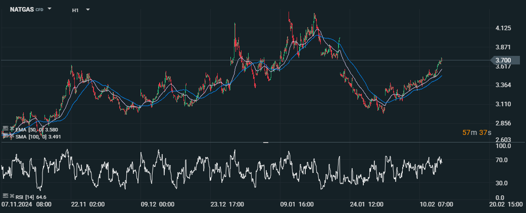 Cena amerického zemného plynu sa obchoduje na 3,700 USD, pričom rast pokračuje v dôsledku zvýšeného dopytu po vykurovaní a silného exportu LNG. Exponenciálny kĺzavý priemer EMA 50 (modrý) na úrovni 3,580 USD a jednoduchý kĺzavý priemer SMA 100 (sivý) na úrovni 3,491 USD potvrdzujú býčí trend, keďže cena zostáva nad týmito indikátormi. Index relatívnej sily RSI 14 na úrovni 64,6 naznačuje rastúci nákupný tlak, avšak stále pod kritickou hranicou 70. Zdroj: xStation5