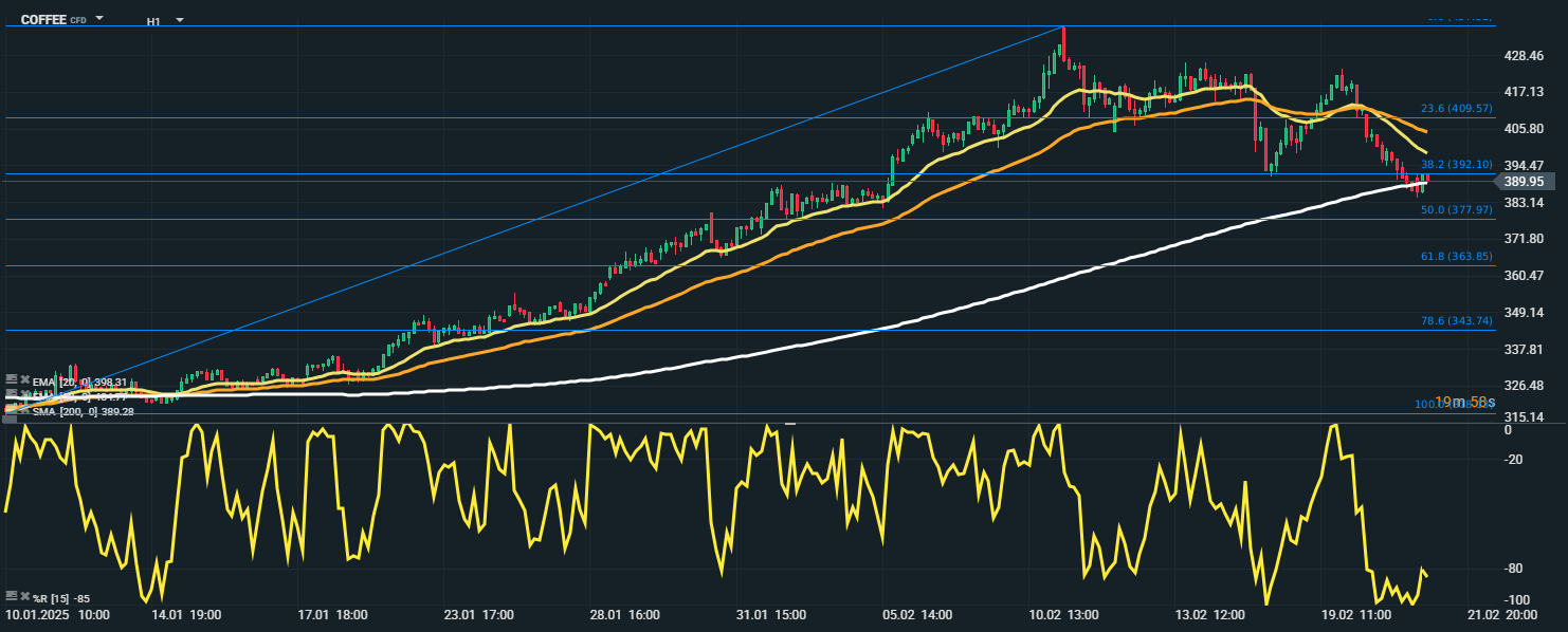 Trh s kávou v posledných týždňoch zaznamenal silný rast, avšak aktuálny vývoj naznačuje, že býčí momentum slabne. Po dosiahnutí vrcholu 438 $ došlo k poklesu na súčasných 390 $, čo predstavuje prepad o 11 %. Otázkou teraz zostáva, či ide iba o dočasnú korekciu, alebo začiatok dlhodobejšieho zostupného trendu.