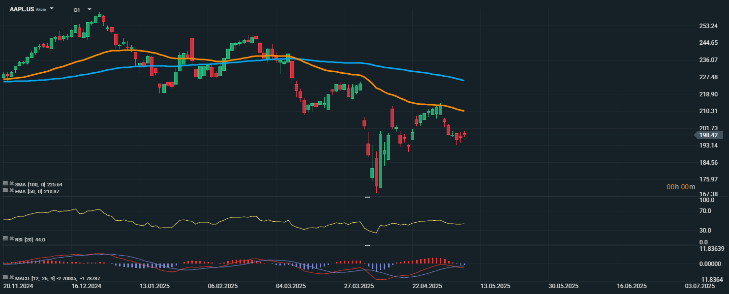 Akcie spoločnosti Apple (AAPL.US) sa v súčasnosti obchodujú na úrovni 198,42 USD a pohybujú sa v rámci klesajúceho trendu, ktorý začal po neúspešnom pokuse prekonať rezistenciu nad 210 USD. Cena zostáva pod kĺzavými priemerkami EMA 50 (210,37 USD) a SMA 100 (225,64 USD), čo potvrdzuje pokračujúcu slabosť titulu z technického hľadiska.