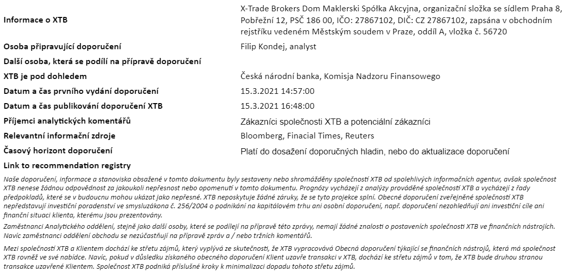 Tento materiál je marketingovou komunikáciou v zmysle čl. 24 ods. 3 smernice Európskeho parlamentu a Rady 2014/65/EÚ z 15. mája 2014 o trhoch s finančnými nástrojmi, ktorou sa mení smernica 2002/92/ES a smernica 2011/61/EÚ (MiFID II). Marketingová komunikácia nie je investičným odporúčaním ani informáciou odporúčajúcou alebo navrhujúcou investičnú stratégiu v zmysle nariadenia Európskeho parlamentu a Rady (EÚ) č. 596/2014 zo 16. apríla 2014 o zneužívaní trhu (nariadenie o zneužívaní trhu) a o zrušení smernice Európskeho parlamentu a Rady 2003/6/ES a smerníc Komisie 2003/124/ES, 2003/125/ES a 2004/72/ES a delegovaného nariadenia Komisie (EÚ) 2016/958 z 9. marca 2016, ktorým sa dopĺňa nariadenie Európskeho parlamentu a Rady (EÚ) č. 596/2014, pokiaľ ide o regulačné technické predpisy upravujúce technické opatrenia na objektívnu prezentáciu investičných odporúčaní alebo iných informácií, ktorými sa odporúča alebo navrhuje investičná stratégia, a na zverejňovanie osobitných záujmov alebo uvádzanie konfliktov záujmov v zmysle zákona č. 566/2001 Z. z. o cenných papieroch a investičných službách. Marketingová komunikácia je pripravená s najvyššou starostlivosťou, objektivitou, prezentuje fakty známe autorovi k dátumu prípravy a neobsahuje žiadne hodnotiace prvky. Marketingová komunikácia je pripravená bez zohľadnenia potrieb klienta, jeho individuálnej finančnej situácie a nijakým spôsobom nepredstavuje investičnú stratégiu. Marketingová komunikácia nepredstavuje ponuku na predaj, ponuku, predplatné, výzvu na nákup, reklamu alebo propagáciu akýchkoľvek finančných nástrojov. XTB S.A. organizačná zložka nezodpovedá za žiadne kroky alebo opomenutia klienta, najmä za nadobudnutie alebo predaj finančných nástrojov. XTB nezodpovedá za žiadnu stratu alebo škodu, vrátane, bez obmedzenia, akejkoľvek straty, ktorá môže vzniknúť priamo alebo nepriamo, spôsobená na základe informácií obsiahnutých v tejto marketingovej komunikácii. V prípade, že marketingová komunikácia obsahuje akékoľvek informácie o akýchkoľvek výsledkoch týkajúcich sa finančných nástrojov v nej uvedených, nepredstavujú žiadnu záruku ani prognózu budúcich výsledkov. Minulá výkonnosť nemusí nevyhnutne naznačovať budúce výsledky a každá osoba konajúca na základe týchto informácií tak robí výlučne na vlastné riziko.