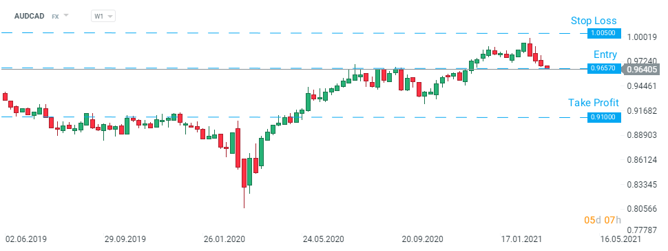 Morgan Stanley odporúča zaujať krátku pozíciu na menovom páre AUDCAD na hodnote 0,9657 s cieľom 0,9100 a príkazom stop loss na hladine 1,0050. Zdroj: xStation5