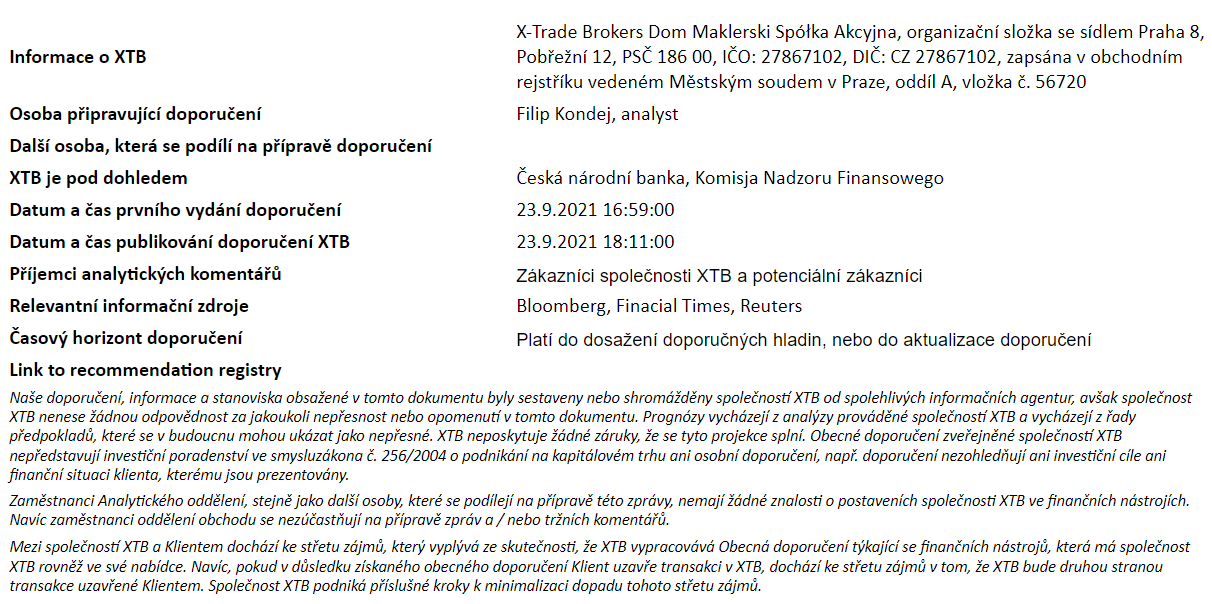 Tento materiál je marketingovou komunikáciou v zmysle čl. 24 ods. 3 smernice Európskeho parlamentu a Rady 2014/65/EÚ z 15. mája 2014 o trhoch s finančnými nástrojmi, ktorou sa mení smernica 2002/92/ES a smernica 2011/61/EÚ (MiFID II). Marketingová komunikácia nie je investičným odporúčaním ani informáciou odporúčajúcou alebo navrhujúcou investičnú stratégiu v zmysle nariadenia Európskeho parlamentu a Rady (EÚ) č. 596/2014 zo 16. apríla 2014 o zneužívaní trhu (nariadenie o zneužívaní trhu) a o zrušení smernice Európskeho parlamentu a Rady 2003/6/ES a smerníc Komisie 2003/124/ES, 2003/125/ES a 2004/72/ES a delegovaného nariadenia Komisie (EÚ) 2016/958 z 9. marca 2016, ktorým sa dopĺňa nariadenie Európskeho parlamentu a Rady (EÚ) č. 596/2014, pokiaľ ide o regulačné technické predpisy upravujúce technické opatrenia na objektívnu prezentáciu investičných odporúčaní alebo iných informácií, ktorými sa odporúča alebo navrhuje investičná stratégia, a na zverejňovanie osobitných záujmov alebo uvádzanie konfliktov záujmov v zmysle zákona č. 566/2001 Z. z. o cenných papieroch a investičných službách. Marketingová komunikácia je pripravená s najvyššou starostlivosťou, objektivitou, prezentuje fakty známe autorovi k dátumu prípravy a neobsahuje žiadne hodnotiace prvky. Marketingová komunikácia je pripravená bez zohľadnenia potrieb klienta, jeho individuálnej finančnej situácie a nijakým spôsobom nepredstavuje investičnú stratégiu. Marketingová komunikácia nepredstavuje ponuku na predaj, ponuku, predplatné, výzvu na nákup, reklamu alebo propagáciu akýchkoľvek finančných nástrojov. XTB S.A. organizačná zložka nezodpovedá za žiadne kroky alebo opomenutia klienta, najmä za nadobudnutie alebo predaj finančných nástrojov. XTB nezodpovedá za žiadnu stratu alebo škodu, vrátane, bez obmedzenia, akejkoľvek straty, ktorá môže vzniknúť priamo alebo nepriamo, spôsobená na základe informácií obsiahnutých v tejto marketingovej komunikácii. V prípade, že marketingová komunikácia obsahuje akékoľvek informácie o akýchkoľvek výsledkoch týkajúcich sa finančných nástrojov v nej uvedených, nepredstavujú žiadnu záruku ani prognózu budúcich výsledkov. Minulá výkonnosť nemusí nevyhnutne naznačovať budúce výsledky a každá osoba konajúca na základe týchto informácií tak robí výlučne na vlastné riziko.