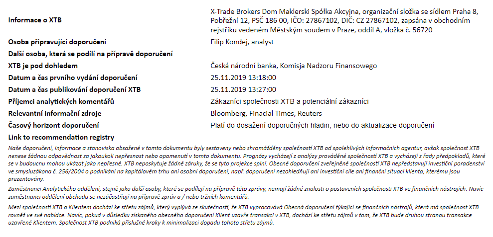 Tento materiál je marketingovou komunikáciou v zmysle čl. 24 ods. 3 smernice Európskeho parlamentu a Rady 2014/65/EÚ z 15. mája 2014 o trhoch s finančnými nástrojmi, ktorou sa mení smernica 2002/92/ES a smernica 2011/61/EÚ (MiFID II). Marketingová komunikácia nie je investičným odporúčaním ani informáciou odporúčajúcou alebo navrhujúcou investičnú stratégiu v zmysle nariadenia Európskeho parlamentu a Rady (EÚ) č. 596/2014 zo 16. apríla 2014 o zneužívaní trhu (nariadenie o zneužívaní trhu) a o zrušení smernice Európskeho parlamentu a Rady 2003/6/ES a smerníc Komisie 2003/124/ES, 2003/125/ES a 2004/72/ES a delegovaného nariadenia Komisie (EÚ) 2016/958 z 9. marca 2016, ktorým sa dopĺňa nariadenie Európskeho parlamentu a Rady (EÚ) č. 596/2014, pokiaľ ide o regulačné technické predpisy upravujúce technické opatrenia na objektívnu prezentáciu investičných odporúčaní alebo iných informácií, ktorými sa odporúča alebo navrhuje investičná stratégia, a na zverejňovanie osobitných záujmov alebo uvádzanie konfliktov záujmov v zmysle zákona č. 566/2001 Z. z. o cenných papieroch a investičných službách. Marketingová komunikácia je pripravená s najvyššou starostlivosťou, objektivitou, prezentuje fakty známe autorovi k dátumu prípravy a neobsahuje žiadne hodnotiace prvky. Marketingová komunikácia je pripravená bez zohľadnenia potrieb klienta, jeho individuálnej finančnej situácie a nijakým spôsobom nepredstavuje investičnú stratégiu. Marketingová komunikácia nepredstavuje ponuku na predaj, ponuku, predplatné, výzvu na nákup, reklamu alebo propagáciu akýchkoľvek finančných nástrojov. XTB S.A. organizačná zložka nezodpovedá za žiadne kroky alebo opomenutia klienta, najmä za nadobudnutie alebo predaj finančných nástrojov. XTB nezodpovedá za žiadnu stratu alebo škodu, vrátane, bez obmedzenia, akejkoľvek straty, ktorá môže vzniknúť priamo alebo nepriamo, spôsobená na základe informácií obsiahnutých v tejto marketingovej komunikácii. V prípade, že marketingová komunikácia obsahuje akékoľvek informácie o akýchkoľvek výsledkoch týkajúcich sa finančných nástrojov v nej uvedených, nepredstavujú žiadnu záruku ani prognózu budúcich výsledkov. Minulá výkonnosť nemusí nevyhnutne naznačovať budúce výsledky a každá osoba konajúca na základe týchto informácií tak robí výlučne na vlastné riziko.