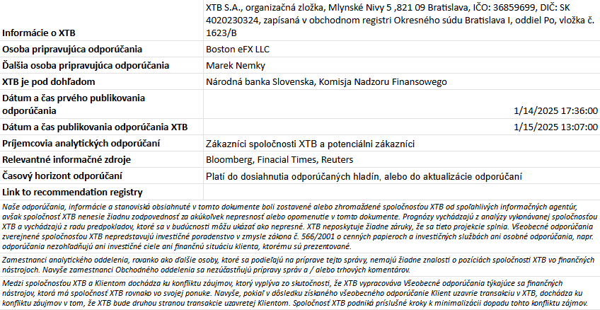 Tento materiál je marketingovou komunikáciou v zmysle čl. 24 ods. 3 smernice Európskeho parlamentu a Rady 2014/65/EÚ z 15. mája 2014 o trhoch s finančnými nástrojmi, ktorou sa mení smernica 2002/92/ES a smernica 2011/61/EÚ (MiFID II). Marketingová komunikácia nie je investičným odporúčaním ani informáciou odporúčajúcou alebo navrhujúcou investičnú stratégiu v zmysle nariadenia Európskeho parlamentu a Rady (EÚ) č. 596/2014 zo 16. apríla 2014 o zneužívaní trhu (nariadenie o zneužívaní trhu) a o zrušení smernice Európskeho parlamentu a Rady 2003/6/ES a smerníc Komisie 2003/124/ES, 2003/125/ES a 2004/72/ES a delegovaného nariadenia Komisie (EÚ) 2016/958 z 9. marca 2016, ktorým sa dopĺňa nariadenie Európskeho parlamentu a Rady (EÚ) č. 596/2014, pokiaľ ide o regulačné technické predpisy upravujúce technické opatrenia na objektívnu prezentáciu investičných odporúčaní alebo iných informácií, ktorými sa odporúča alebo navrhuje investičná stratégia, a na zverejňovanie osobitných záujmov alebo uvádzanie konfliktov záujmov v zmysle zákona č. 566/2001 Z. z. o cenných papieroch a investičných službách. Marketingová komunikácia je pripravená s najvyššou starostlivosťou, objektivitou, prezentuje fakty známe autorovi k dátumu prípravy a neobsahuje žiadne hodnotiace prvky. Marketingová komunikácia je pripravená bez zohľadnenia potrieb klienta, jeho individuálnej finančnej situácie a nijakým spôsobom nepredstavuje investičnú stratégiu. Marketingová komunikácia nepredstavuje ponuku na predaj, ponuku, predplatné, výzvu na nákup, reklamu alebo propagáciu akýchkoľvek finančných nástrojov. XTB S.A. organizačná zložka nezodpovedá za žiadne kroky alebo opomenutia klienta, najmä za nadobudnutie alebo predaj finančných nástrojov. XTB nezodpovedá za žiadnu stratu alebo škodu, vrátane, bez obmedzenia, akejkoľvek straty, ktorá môže vzniknúť priamo alebo nepriamo, spôsobená na základe informácií obsiahnutých v tejto marketingovej komunikácii. V prípade, že marketingová komunikácia obsahuje akékoľvek informácie o akýchkoľvek výsledkoch týkajúcich sa finančných nástrojov v nej uvedených, nepredstavujú žiadnu záruku ani prognózu budúcich výsledkov. Minulá výkonnosť nemusí nevyhnutne naznačovať budúce výsledky a každá osoba konajúca na základe týchto informácií tak robí výlučne na vlastné riziko.