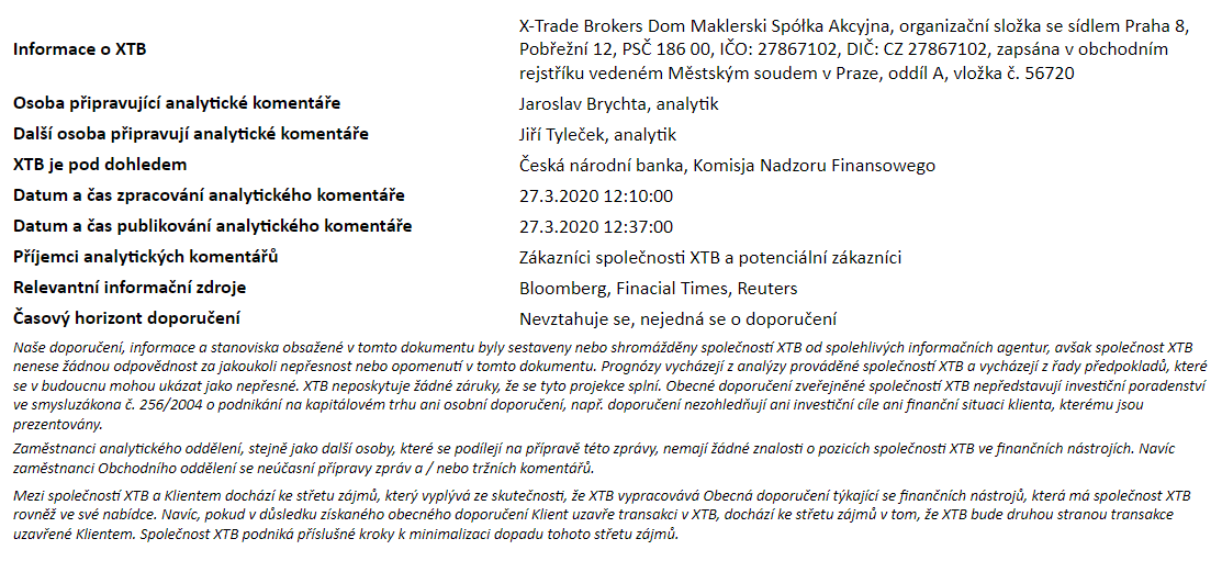 Tento materiál je marketingovou komunikáciou v zmysle čl. 24 ods. 3 smernice Európskeho parlamentu a Rady 2014/65/EÚ z 15. mája 2014 o trhoch s finančnými nástrojmi, ktorou sa mení smernica 2002/92/ES a smernica 2011/61/EÚ (MiFID II). Marketingová komunikácia nie je investičným odporúčaním ani informáciou odporúčajúcou alebo navrhujúcou investičnú stratégiu v zmysle nariadenia Európskeho parlamentu a Rady (EÚ) č. 596/2014 zo 16. apríla 2014 o zneužívaní trhu (nariadenie o zneužívaní trhu) a o zrušení smernice Európskeho parlamentu a Rady 2003/6/ES a smerníc Komisie 2003/124/ES, 2003/125/ES a 2004/72/ES a delegovaného nariadenia Komisie (EÚ) 2016/958 z 9. marca 2016, ktorým sa dopĺňa nariadenie Európskeho parlamentu a Rady (EÚ) č. 596/2014, pokiaľ ide o regulačné technické predpisy upravujúce technické opatrenia na objektívnu prezentáciu investičných odporúčaní alebo iných informácií, ktorými sa odporúča alebo navrhuje investičná stratégia, a na zverejňovanie osobitných záujmov alebo uvádzanie konfliktov záujmov v zmysle zákona č. 566/2001 Z. z. o cenných papieroch a investičných službách. Marketingová komunikácia je pripravená s najvyššou starostlivosťou, objektivitou, prezentuje fakty známe autorovi k dátumu prípravy a neobsahuje žiadne hodnotiace prvky. Marketingová komunikácia je pripravená bez zohľadnenia potrieb klienta, jeho individuálnej finančnej situácie a nijakým spôsobom nepredstavuje investičnú stratégiu. Marketingová komunikácia nepredstavuje ponuku na predaj, ponuku, predplatné, výzvu na nákup, reklamu alebo propagáciu akýchkoľvek finančných nástrojov. XTB S.A. organizačná zložka nezodpovedá za žiadne kroky alebo opomenutia klienta, najmä za nadobudnutie alebo predaj finančných nástrojov. XTB nezodpovedá za žiadnu stratu alebo škodu, vrátane, bez obmedzenia, akejkoľvek straty, ktorá môže vzniknúť priamo alebo nepriamo, spôsobená na základe informácií obsiahnutých v tejto marketingovej komunikácii. V prípade, že marketingová komunikácia obsahuje akékoľvek informácie o akýchkoľvek výsledkoch týkajúcich sa finančných nástrojov v nej uvedených, nepredstavujú žiadnu záruku ani prognózu budúcich výsledkov. Minulá výkonnosť nemusí nevyhnutne naznačovať budúce výsledky a každá osoba konajúca na základe týchto informácií tak robí výlučne na vlastné riziko.
