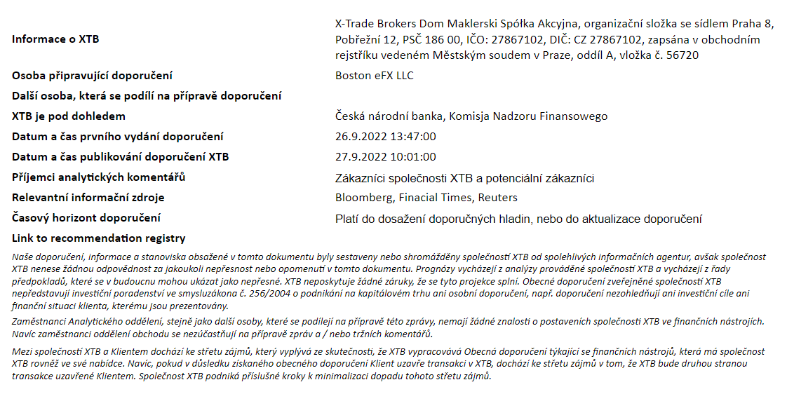 Tento materiál je marketingovou komunikáciou v zmysle čl. 24 ods. 3 smernice Európskeho parlamentu a Rady 2014/65/EÚ z 15. mája 2014 o trhoch s finančnými nástrojmi, ktorou sa mení smernica 2002/92/ES a smernica 2011/61/EÚ (MiFID II). Marketingová komunikácia nie je investičným odporúčaním ani informáciou odporúčajúcou alebo navrhujúcou investičnú stratégiu v zmysle nariadenia Európskeho parlamentu a Rady (EÚ) č. 596/2014 zo 16. apríla 2014 o zneužívaní trhu (nariadenie o zneužívaní trhu) a o zrušení smernice Európskeho parlamentu a Rady 2003/6/ES a smerníc Komisie 2003/124/ES, 2003/125/ES a 2004/72/ES a delegovaného nariadenia Komisie (EÚ) 2016/958 z 9. marca 2016, ktorým sa dopĺňa nariadenie Európskeho parlamentu a Rady (EÚ) č. 596/2014, pokiaľ ide o regulačné technické predpisy upravujúce technické opatrenia na objektívnu prezentáciu investičných odporúčaní alebo iných informácií, ktorými sa odporúča alebo navrhuje investičná stratégia, a na zverejňovanie osobitných záujmov alebo uvádzanie konfliktov záujmov v zmysle zákona č. 566/2001 Z. z. o cenných papieroch a investičných službách. Marketingová komunikácia je pripravená s najvyššou starostlivosťou, objektivitou, prezentuje fakty známe autorovi k dátumu prípravy a neobsahuje žiadne hodnotiace prvky. Marketingová komunikácia je pripravená bez zohľadnenia potrieb klienta, jeho individuálnej finančnej situácie a nijakým spôsobom nepredstavuje investičnú stratégiu. Marketingová komunikácia nepredstavuje ponuku na predaj, ponuku, predplatné, výzvu na nákup, reklamu alebo propagáciu akýchkoľvek finančných nástrojov. XTB S.A. organizačná zložka nezodpovedá za žiadne kroky alebo opomenutia klienta, najmä za nadobudnutie alebo predaj finančných nástrojov. XTB nezodpovedá za žiadnu stratu alebo škodu, vrátane, bez obmedzenia, akejkoľvek straty, ktorá môže vzniknúť priamo alebo nepriamo, spôsobená na základe informácií obsiahnutých v tejto marketingovej komunikácii. V prípade, že marketingová komunikácia obsahuje akékoľvek informácie o akýchkoľvek výsledkoch týkajúcich sa finančných nástrojov v nej uvedených, nepredstavujú žiadnu záruku ani prognózu budúcich výsledkov. Minulá výkonnosť nemusí nevyhnutne naznačovať budúce výsledky a každá osoba konajúca na základe týchto informácií tak robí výlučne na vlastné riziko.