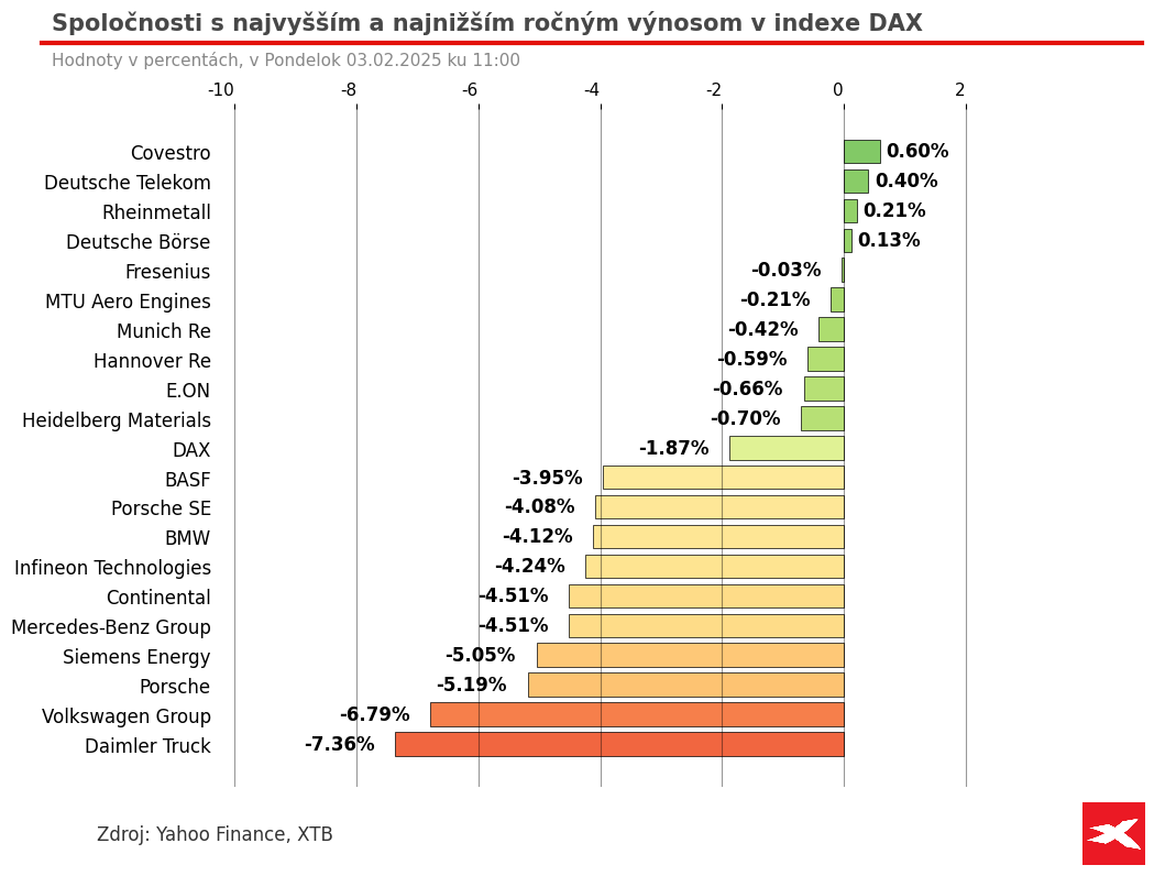 V nemeckom indexe DAX, kde figurujú viaceré automobilky s úzkymi väzbami na Spojené štáty, je pokles ešte výraznejší – DAX stráca 1,87 %. Medzi najviac postihnuté tituly patria akcie Daimler Truck, Volkswagen, Porsche, Mercedes-Benz Group a BMW, ktoré reagujú na možné obchodné obmedzenia výrazným oslabením.