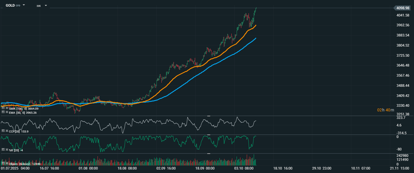 Cena zlata ďalej prudko rastie a aktuálne sa obchoduje na novom historickom maxime 4 098,98 USD za uncu. Trh sa nachádza vo veľmi silnom býčom trende, čo potvrdzuje aj to, že cena sa pohybuje výrazne nad kĺzavými priemermi EMA 50 (3 965,26 USD) a SMA 100 (3 864,09 USD). Oba priemery zároveň vykazujú stabilný rast, čo podporuje pokračujúce pozitívne momentum.