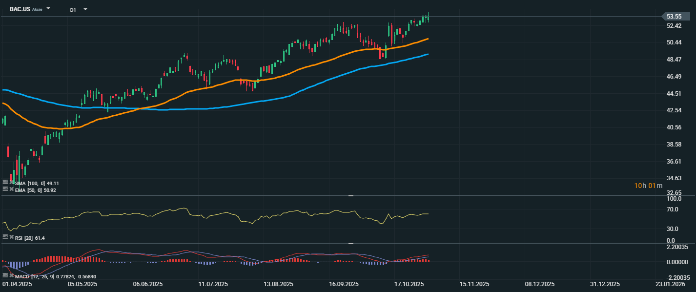 Akcie Bank of America aktuálne rastú a obchodujú sa na úrovni 53,55 USD, čím potvrdzujú pokračujúci býčí trend. Cena sa naďalej drží nad kĺzavými priemermi EMA 50 (50,92 USD) a SMA 100 (49,11 USD), čo podporuje silný rastový sentiment. RSI sa nachádza na hodnote 61,4, teda stále v neutrálne-býčom pásme, bez známok prekúpenosti, čo naznačuje, že priestor na ďalší rast ostáva otvorený. MACD je taktiež v pozitívnom teritóriu a smeruje nahor, čo potvrdzuje silu rastového momenta.