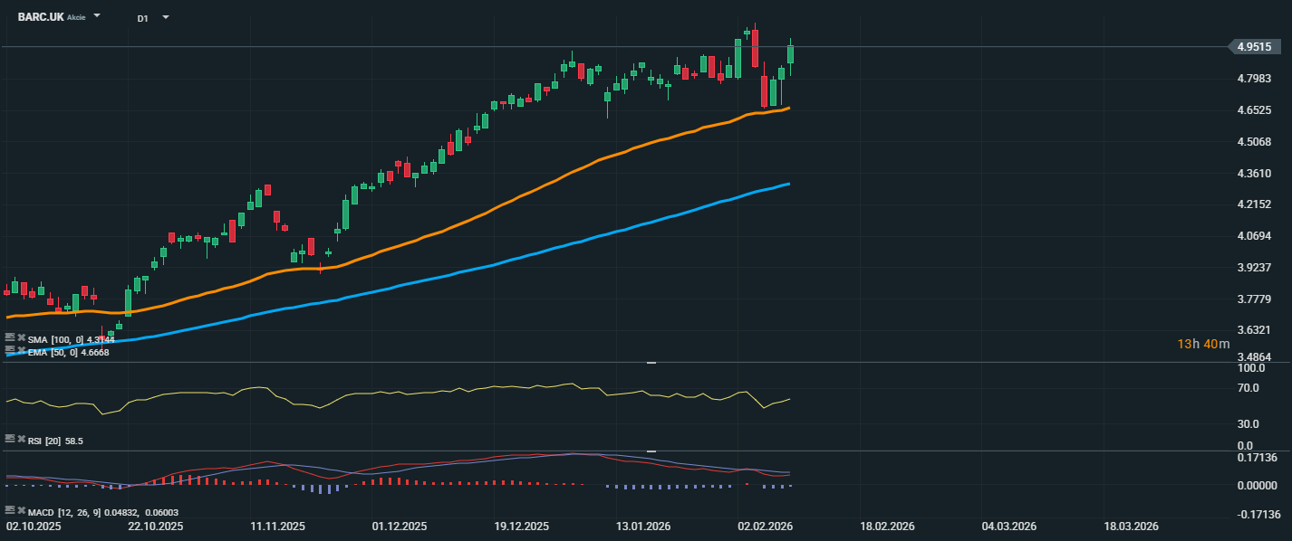 Akcie Barclays sa v súčasnosti obchodujú za cenu okolo 4,95 GBP, čo je blízko ich miestnych maxím. Cena zostáva značne nad kĺzavými priemerkami EMA 50 (približne 4,67 GBP) a SMA 100 (približne 4,34 GBP), čo potvrdzuje strednodobý až dlhodobý rastový trend. Hoci posledných pár dní prinieslo zvýšenú volatilitu, celkovú býčiu štruktúru trhu to nenarušilo. RSI na úrovni 58,5 je mierne nad neutrálnou zónou, čo naznačuje, že kupujúci stále majú navrch, ale zároveň nie sú žiadne známky výrazného prekúpenia. Trh má preto priestor na ďalší rast, hoci nemožno vylúčiť krátkodobú konsolidáciu. Z technického hľadiska je dôležité sledovať oblasť 4,80 – 4,85 GBP, ktorá teraz funguje ako najbližšia podpora. Udržanie tejto úrovne by mohlo otvoriť priestor pre opätovné testovanie a možné prelomenie hranice 5,00 GBP. Naopak, hlbšia korekcia by pravdepodobne smerovala k EMA 50, ktorá v súčasnosti predstavuje silnú dynamickú podporu.
