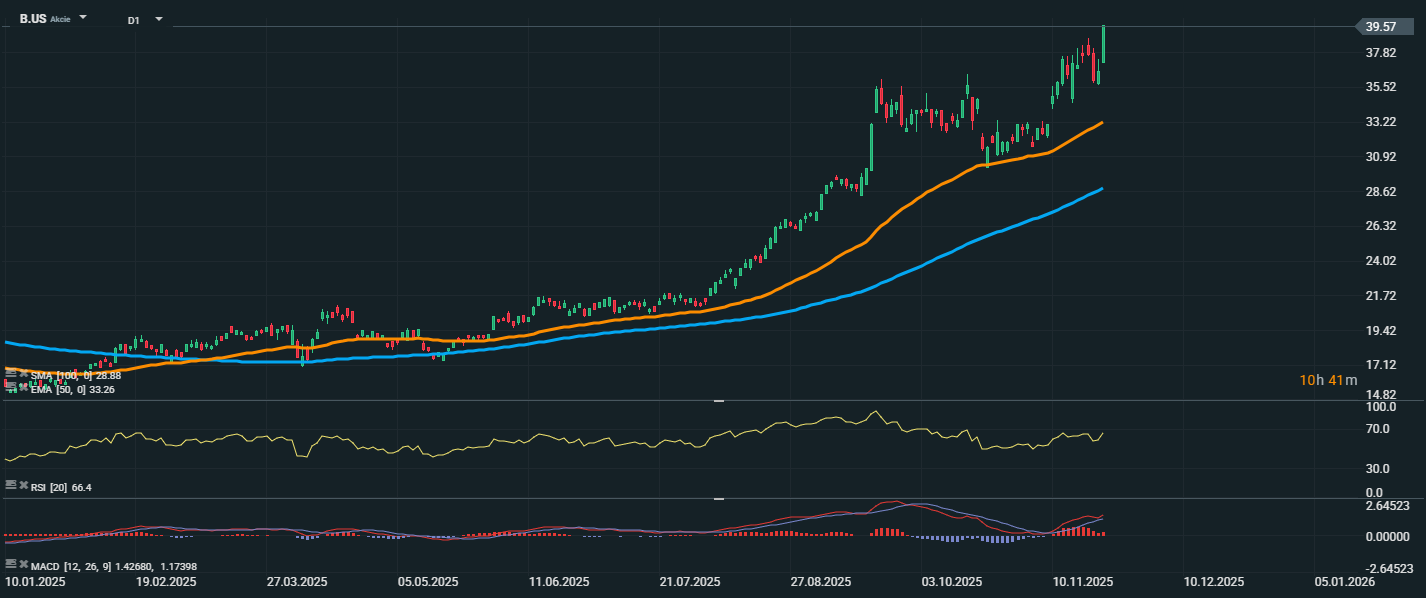 Akcie spoločnosti Barrick Gold predviedli v posledných mesiacoch mimoriadne silný rast, keď aktuálne dosahujú cenu 39,57 USD. Cena sa výrazne odrazila od kĺzavých priemerov – EMA 50 (33,26 USD) a SMA 100 (28,88 USD) – ktoré potvrdzujú silný rastový trend. RSI sa nachádza tesne pod prekúpenou zónou, čo naznačuje silný nákupný záujem, ale zároveň upozorňuje na možné krátkodobé vyčerpanie. Z technického pohľadu je trend naďalej silne býčí, no vzhľadom na prudký rast a hodnoty RSI je možná krátkodobá korekcia alebo konsolidácia. Kľúčovú podporu aktuálne predstavuje úroveň okolo 33 USD, kde sa nachádza EMA 50.