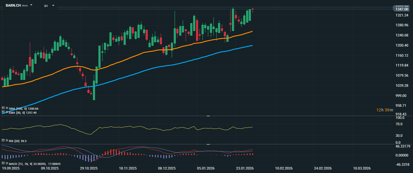 Akcie spoločnosti Barry Callebaut sa po období konsolidácie priblížili k úrovni 1347 CHF, čím testujú lokálne maximá z predchádzajúcich mesiacov. Cena sa stabilne drží nad kĺzavými priemermi EMA 50 (1257,40 CHF) a SMA 100 (1200,66 CHF), čo naznačuje udržanie dlhodobého rastového trendu. RSI osciluje okolo 59,5 bodu, čo signalizuje neutrálne-býčí nastavenie – trh ešte nie je prekupený a zostáva priestor na ďalší rast. Vzhľadom na stabilný trend a opakované testovanie hornej rezistencie rastie pravdepodobnosť potenciálneho prerazenia nahor, najmä ak investori podporia nový strategický smer firmy po nástupe nového CEO. Z technického hľadiska bude kľúčové sledovať, či cena dokáže preraziť úroveň 1347 CHF. V prípade úspechu by sa otvoril priestor pre ďalší rastový impulz. Naopak, prvá dôležitá podpora sa nachádza pri EMA 50 (1257 CHF); jej prelomenie by mohlo naznačiť stratu býčieho momenta.