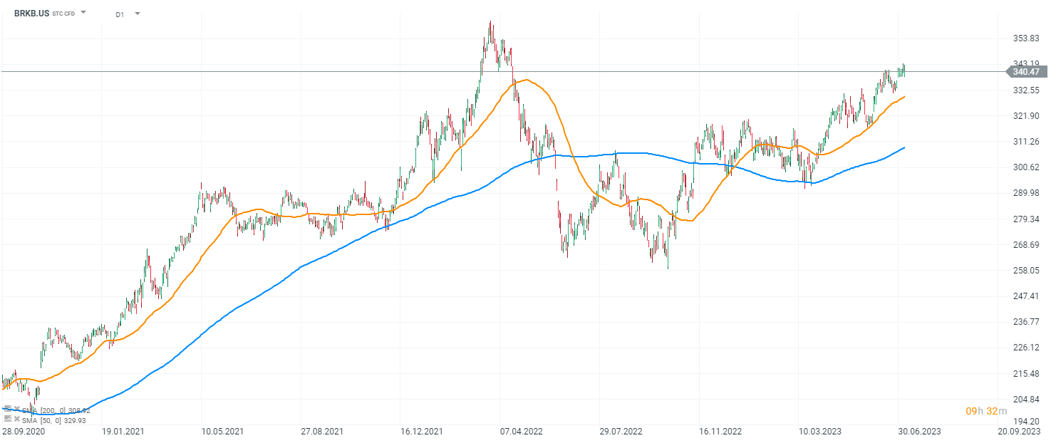 Spoločnosť Berkshire Hathaway (BRKB.US) po oznámení rástla o pár desatín percentných bodov. Ceny akcií sa v súčasnosti nachádzajú nad 200 denným ako aj 50 denným kĺzavým priemerom, a postupne sa tiahnú na maximálne úrovne v oblasti 360 USD. interal D1, Zdroj: xStation5