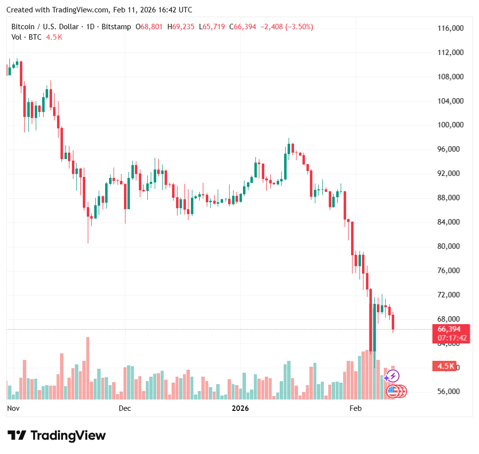 Bitcoin oslabil pod hranicu 67 000 USD, čím prehĺbil nedávnu korekciu v prostredí slabnúceho rizikového sentimentu na globálnych trhoch. Pokles prichádza v čase zvýšenej volatility na akciových trhoch a prehodnocovania očakávaní týkajúcich sa úrokových sadzieb.