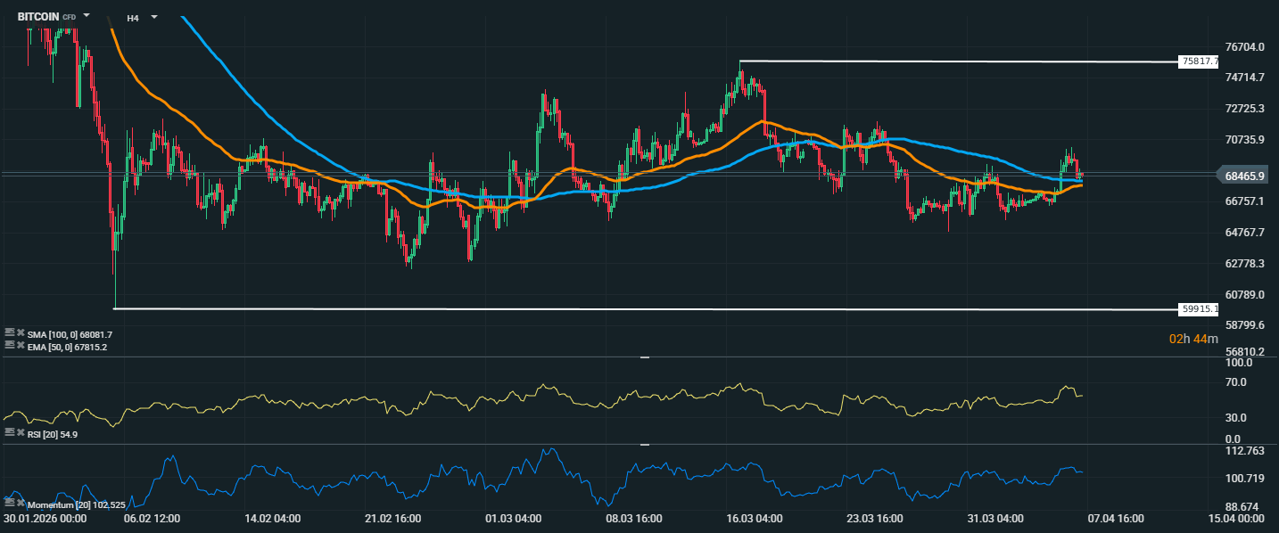 Bitcoin sa aktuálne obchoduje okolo 68 466 USD a po krátkodobom výkyve sa opäť stabilizoval v blízkosti oboch kĺzavých priemerov. Pozitívnym signálom je, že cena zostáva nad EMA 50 na 67 815 USD aj nad SMA 100 na 68 082 USD, čo naznačuje mierne zlepšené krátkodobé technické nastavenie. Trh sa však stále pohybuje v širšom bočnom pásme, kde už dlhší čas chýba výraznejší impulz pre silnejší trendový pohyb. RSI na 54,9 sa drží v neutrálnom pásme a ukazuje, že má bitcoin priestor na pohyb na obe strany bez známok prekúpenosti či prepredanosti. Aj momentum 102,5 naznačuje mierne pozitívnu dynamiku, no zatiaľ nie takú silnú, aby potvrdila začiatok výraznejšej rastovej vlny. Z technického pohľadu tak trh pôsobí skôr stabilizačne, pričom kupujúci získali miernu prevahu, ale zatiaľ nedokázali presadiť jednoznačné prerazenie smerom nahor.