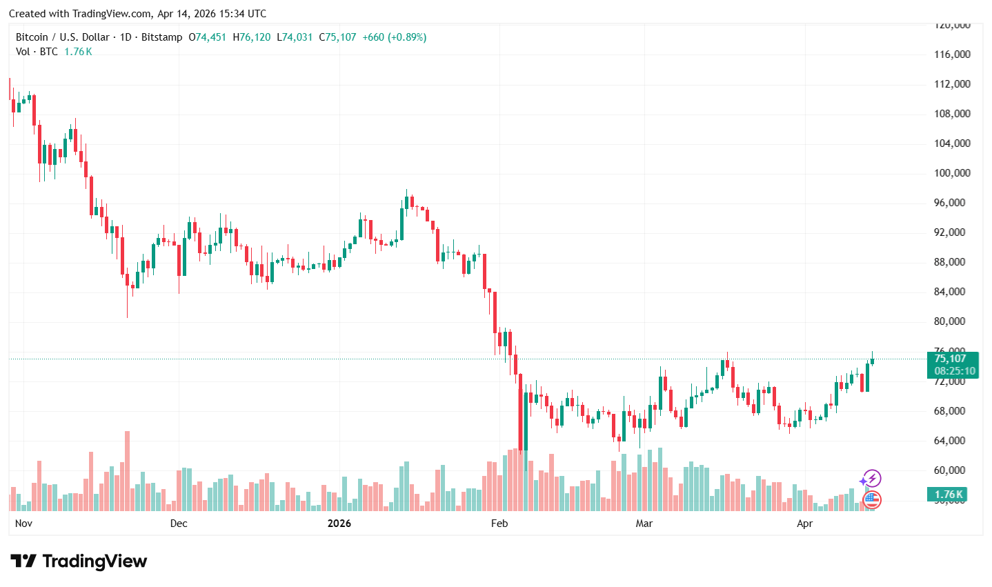 Graf dňa: Bitcoin rastie k úrovni 75 tisíc USD, keďže americký dolár oslabuje 📈 (14.04.2026)