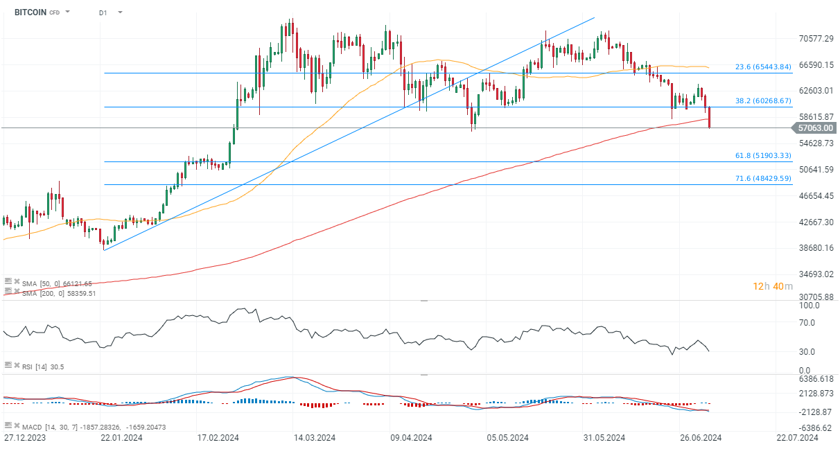 Cena BITCOINu dnes klesá pod kľúčovú zónu podpory na úrovni 58 000 USD, kde môžeme vidieť SMA200 (červená čiara). Táto úroveň je teraz hlavnou zónou krátkodobej rezistencie.