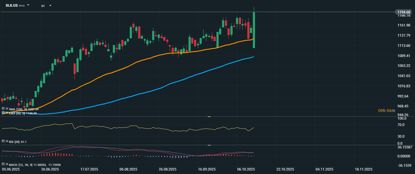 Cena akcií BlackRock sa odrazila od kĺzavého priemeru EMA 50 (1190,30 USD) a zostáva výrazne nad SMA 100 (1097,34 USD), čo potvrdzuje dlhodobý rastový trend. RSI sa nachádza na hodnote 61,1, teda v neutrálno-býčej zóne, bez známok prekúpenosti. MACD vykazuje pozitívne hodnoty, pričom je blízko možného býčieho prekríženia, čo podporuje možnosť pokračovania rastového trendu.