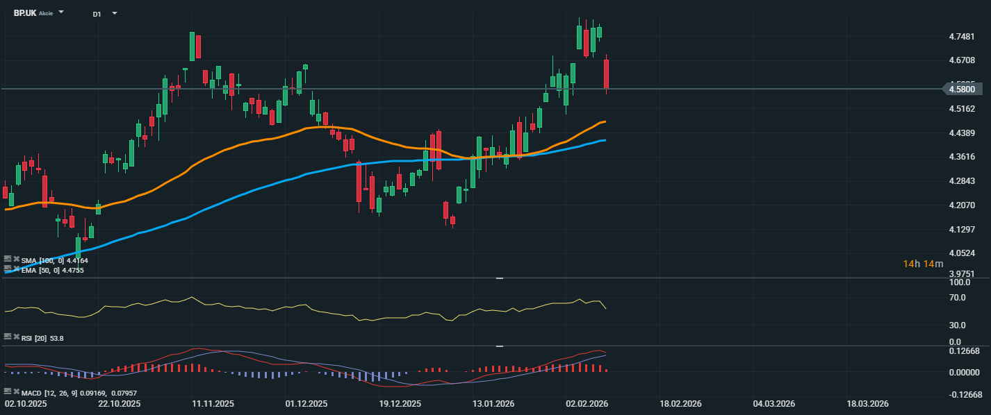 Akcie britskej ropnej spoločnosti BP sa v súčasnosti obchodujú za 4,58 GBP, pričom nedávno došlo k korekcii po prudkom raste, ktorý dosiahol vrchol na úrovni približne 4,74 GBP. Cena sa však stále drží nad kĺzavými priemerkami EMA 50 (4,48 GBP) a SMA 100 (4,42 GBP), čo naznačuje stále pozitívnu technickú konfiguráciu. RSI na úrovni 53,8 poukazuje na neutrálnu zónu bez známok prekúpenosti alebo prepredanosti, čo ponecháva priestor pre ďalší pohyb ceny v oboch smeroch. MACD zostáva nad signálnou líniou, ale histogram začína slabnúť, čo môže byť varovaním pred možným krátkodobým spomalením rastu. Na udržanie býčieho scenára bude dôležité, aby cena zostala nad úrovňou podpory 4,42 – 4,48 GBP, t. j. v oblasti kĺzavých priemerov. Prekonanie týchto úrovní by mohlo otvoriť priestor pre hlbšiu korekciu. Naopak, návrat k úrovni odporu 4,74 GBP by signalizoval obnovenie nákupného záujmu.