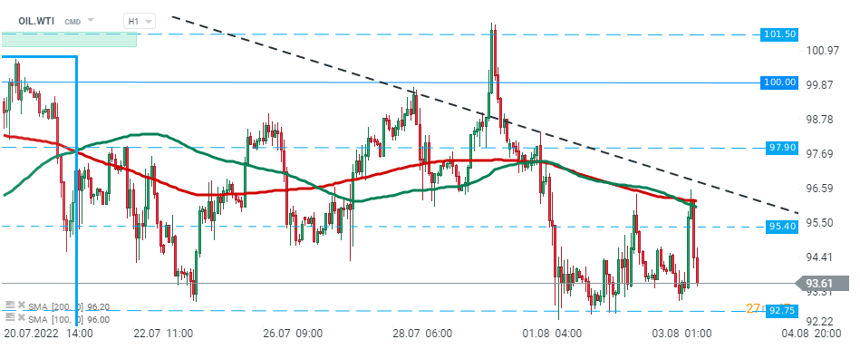 Nové zprávy neměly velký vliv na ceny ropy. WTI Oil (OIL.WTI) se stále obchoduje kolem $93.60. Zdroj: xStation5