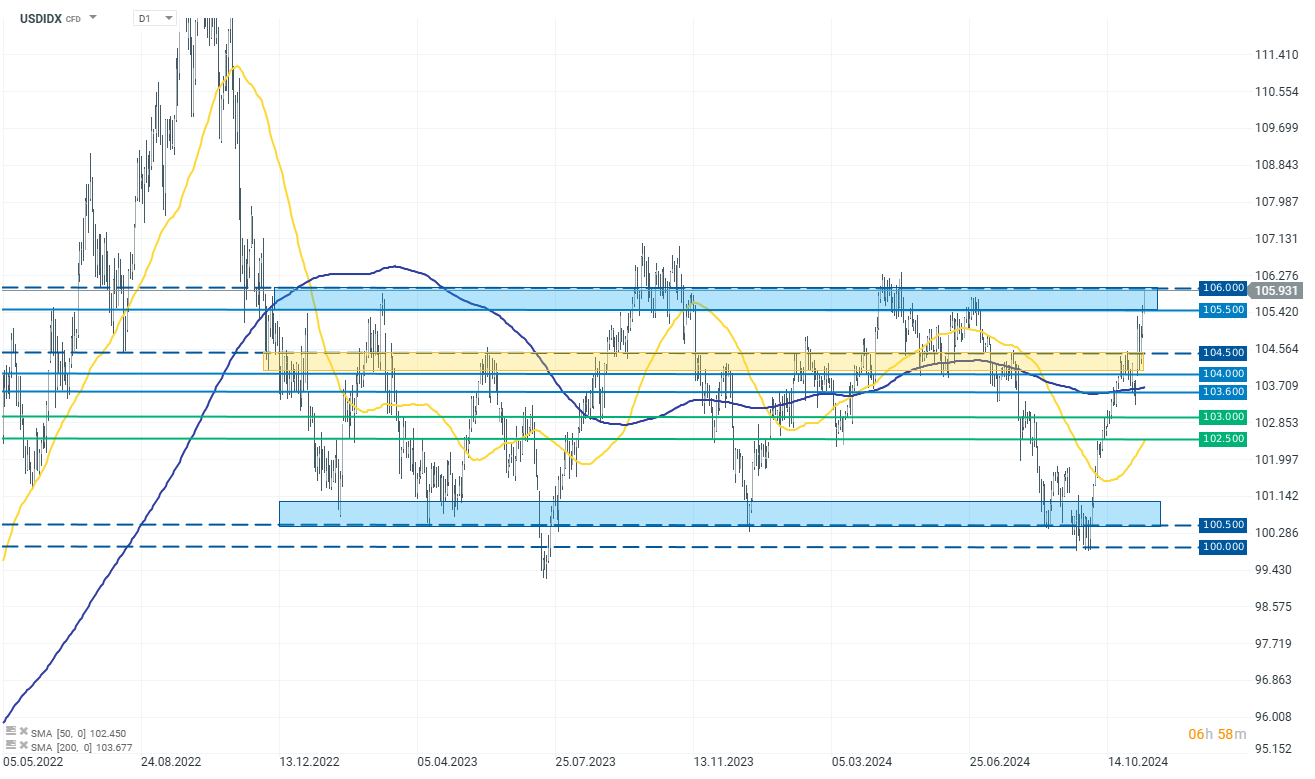 Z pohľadu technickej analýzy sa USDIDX blíži k dôležitej hranici 106 bodov, ktorá bola za posledné dva roky konsolidácie testovaná iba krátko.