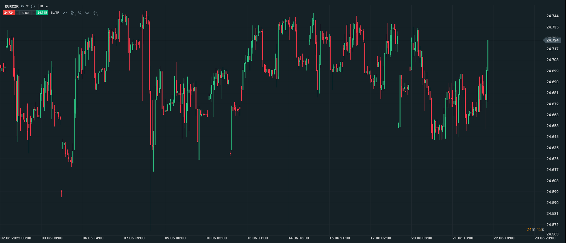 Měnový pár EUR/CZK se po zveřejnění úrokových sazeb dostal k hladině 26,72. Zdroj: xStation5.