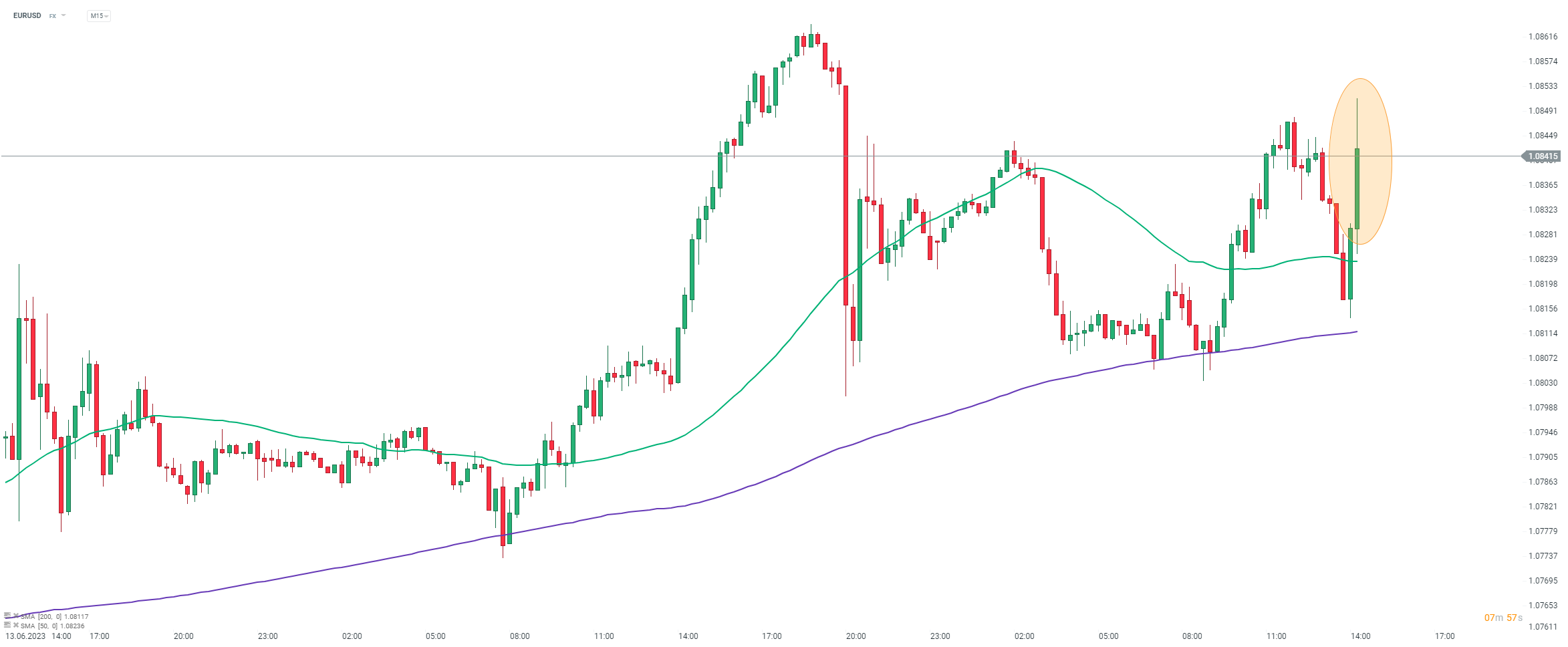 EURUSD vyskočil v reakci na rozhodnutí ECB o zvýšení úrokových sazeb. Zdroj: xStation5