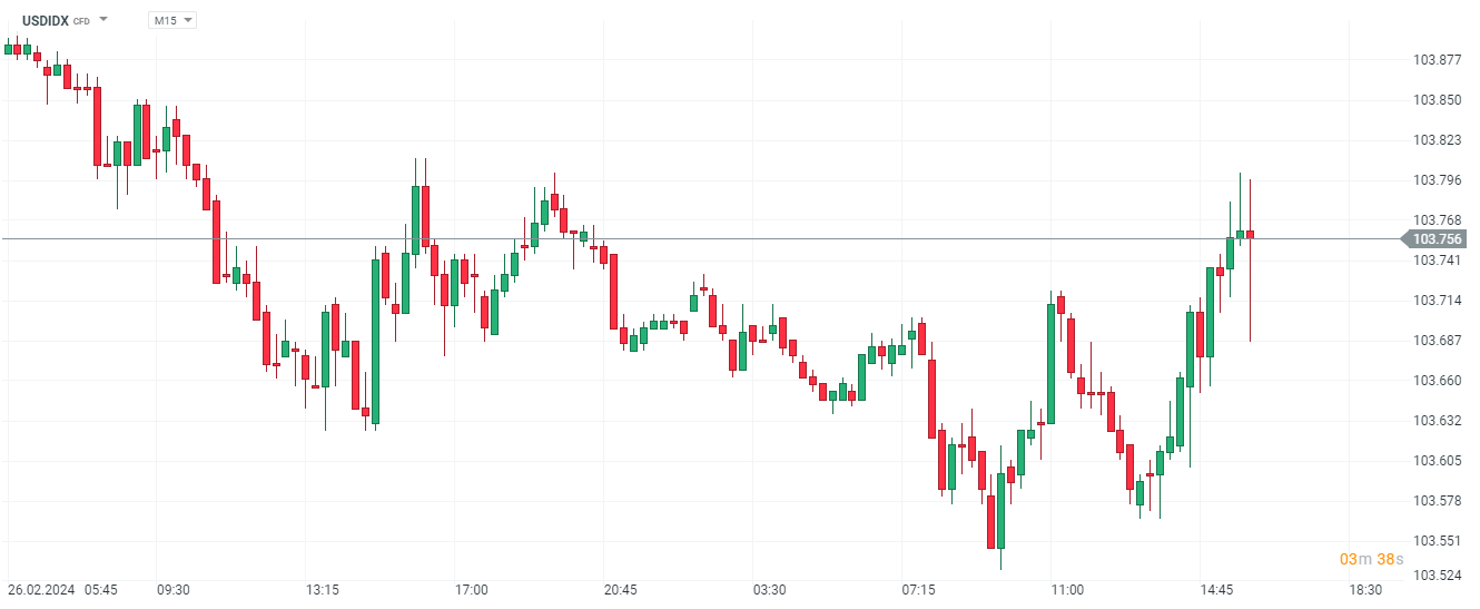 Dolárový index rýchlo vymazal svoju počiatočnú klesajúcu reakciu. Býci sa pokúšajú opäť stúpnuť na úroveň 103,8, a to aj napriek všeobecne slabším ekonomickým údajom z USA dnes.