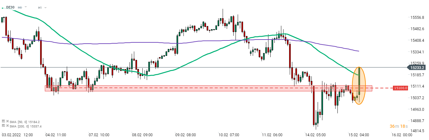 DE30 vyskočil v reakci stažení ruských jednotek od ukrajinských hranic. DE30 vyskočil nad úroveň rezistence 15 100 bodů. Zdroj: xStation5