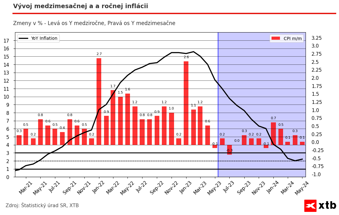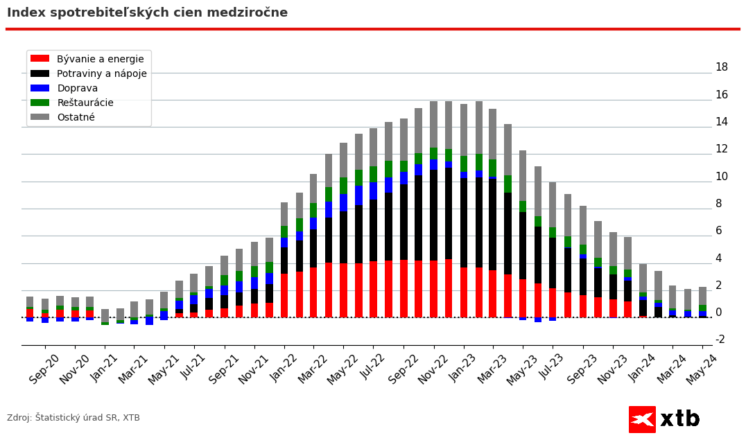 Rast cien sa v mesiaci máj mierne zrýchlil a to o 0,1 % medzimesačne. Primárnym dôvodom bol rast cien potravín a nealkoholických nápojov, ktoré vzrástli až o 1 % medzimesačne. Na druhej strane to však mierne tlmili nižšie ceny pohonných hmôt ale taktiež aj nižšie ceny imputovaného nájomného a nižšie ceny nábytku a bytových zariadení. V minulom roku sme však pozorovali pokles cien, keďže "obedy zadarmo" spôsobili medzimesačný pokles v sekcii Reštaurácii a Hotelov až o 4,5 %. Keďže nám však tento efekt vypadáva, tak medziročná inflácia mierne poskočila a to z 2,1 % na 2,2 %.
