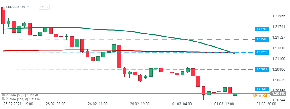 EURUSD pokračoval v obchodování mírně pod úrovní 1,2050 také po zveřejnění statistik ISM. Zdroj: xStation5
