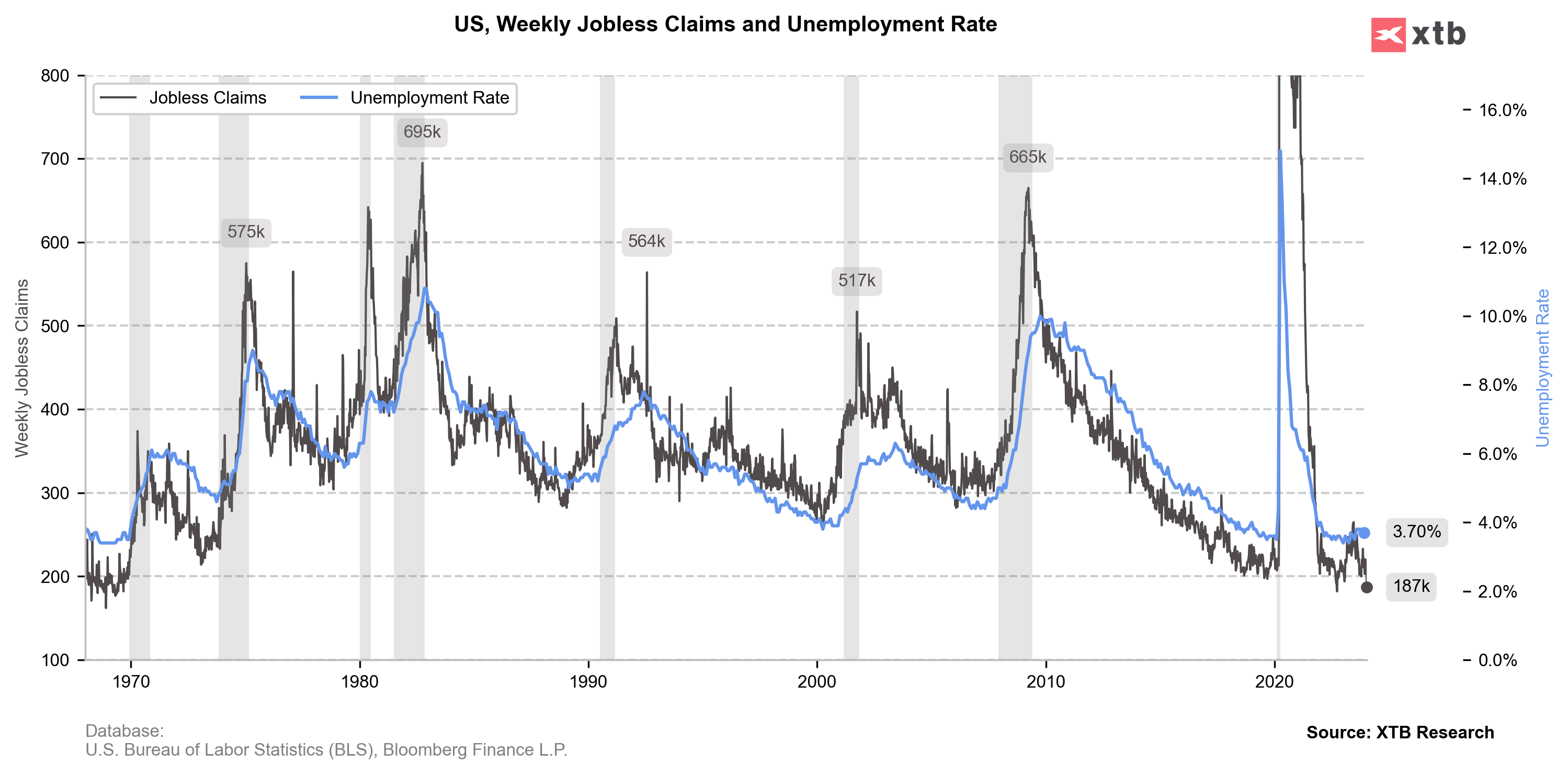 Počet žiadostí o podporu v nezamestnanosti v USA 14:30: 187 tisíc. vs.očakávaných 205 tis. a 202 tisíc predošlých.